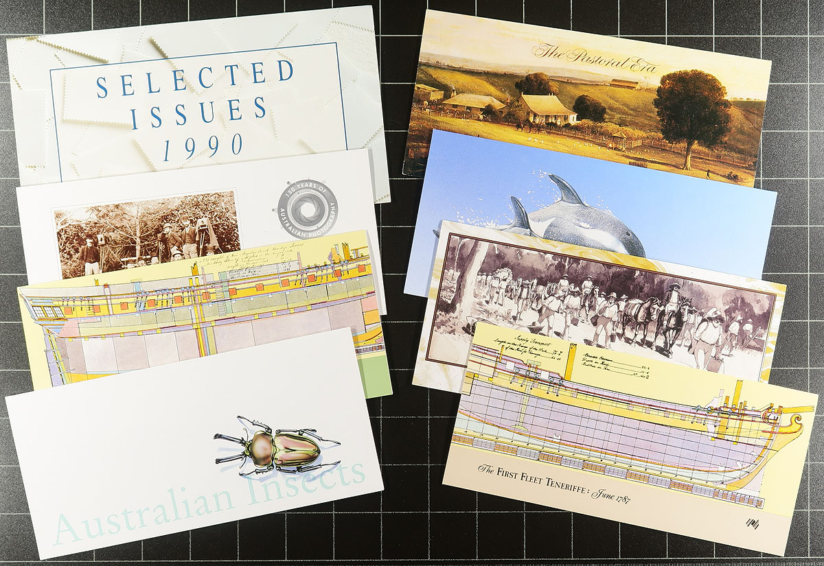Accumulation of roughly 115 presentation packs, 1980's-1990's. A lovely group with only mild duplication, containing singles, plenty of sets, and a few souvenir sheets, along with a few joint issues and stamped labels, with some items cataloguing $10 and up. Face value for the lot totals AUD$305.00 (most denominations range from 45c to $20). A great group for the topical or thematic collector as we saw several suitable subjects including ships and other transportation, scenery, birds and other animals, flowers and nature, and more. Clean and very fine. Estimate =