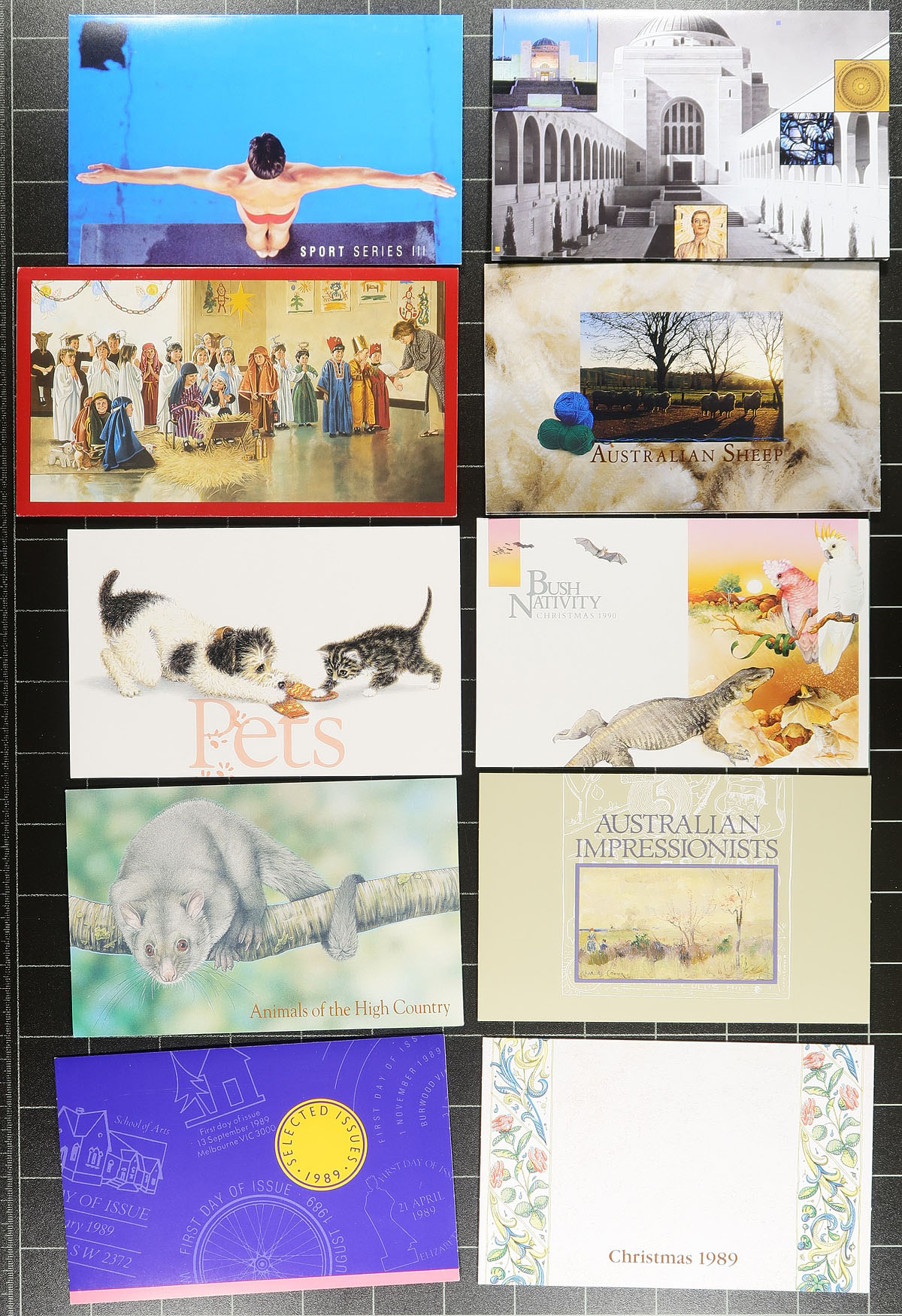 Accumulation of roughly 115 presentation packs, 1980's-1990's. A lovely group with only mild duplication, containing singles, plenty of sets, and a few souvenir sheets, along with a few joint issues and stamped labels, with some items cataloguing $10 and up. Face value for the lot totals AUD$305.00 (most denominations range from 45c to $20). A great group for the topical or thematic collector as we saw several suitable subjects including ships and other transportation, scenery, birds and other animals, flowers and nature, and more. Clean and very fine. Estimate =
