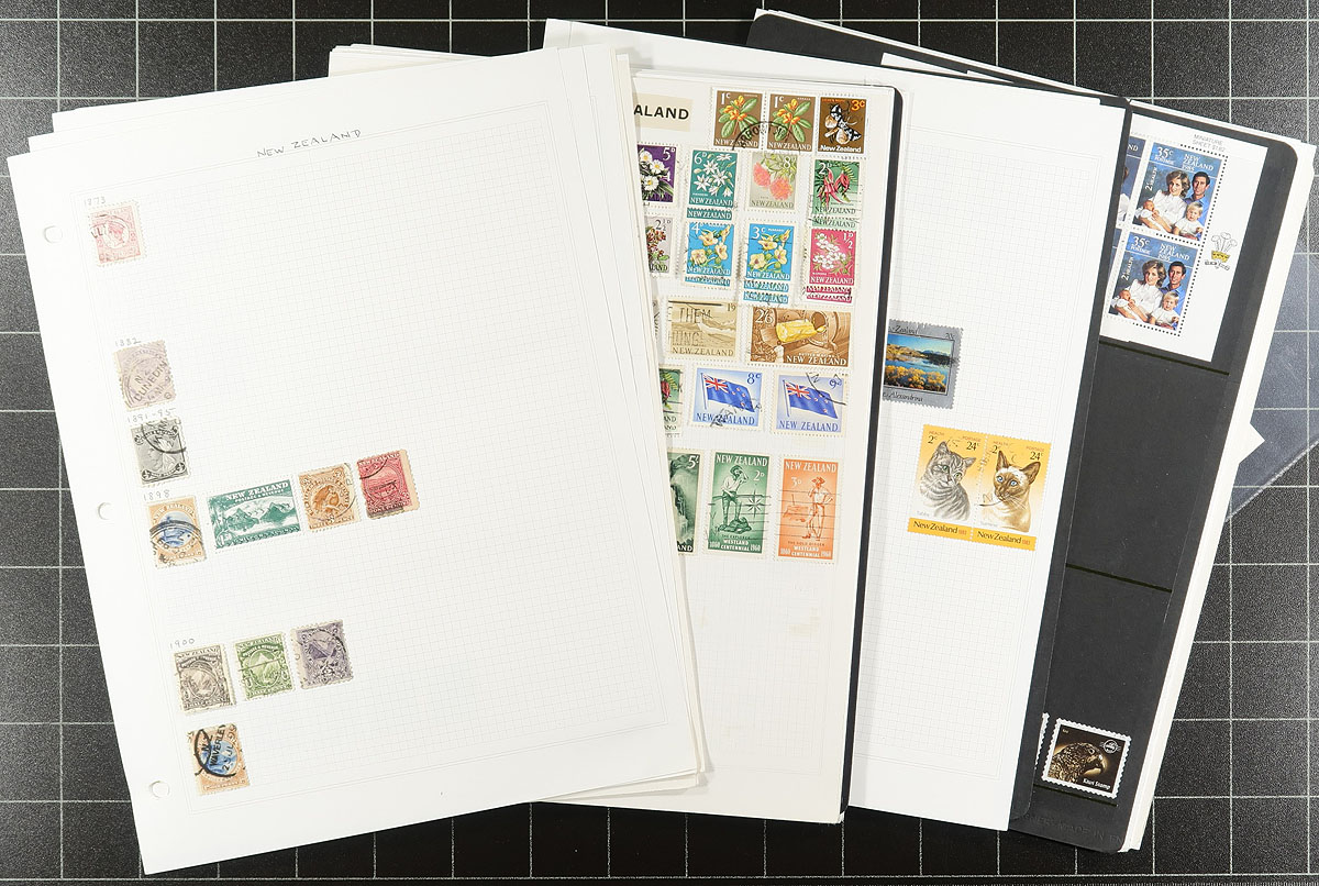 Large accumulation of used New Zealand, 1874-2011, containing a few thousand stamps, in roughly 100 album or homemade pages, and roughly 400 glassines in a box. This neatly organized group, surprising for its quantity, generally ranges from Scott #55/2363, along with selections of postal fiscals, semi-postals, airmails, and modern issues. The album pages and glassines are neatly organized using Scott numbers, with a spot check indicating some singles and partial sets cataloguing from $5 to $10 each, leaving finds, including better postmarks, to the dedicated collector. Overall fine to very fine. Estimate =