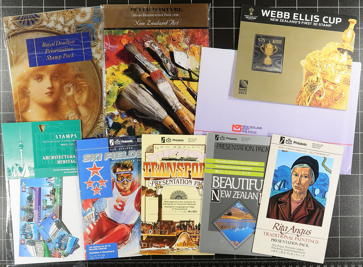 Clean collection of roughly 95 New Zealand presentation and thematic packs, 1970's-2000's, containing several hundreds of stamps, mostly sets and a few souvenir sheets in a box. The packs also include a few first day covers, postcards, and perhaps other philatelic items. Many of the sets catalogue $5 to $10 each, with the previous owner's count of usable face value postage totaling over $1,000 New Zealand dollars. A clean group, with very little if any duplication, ideal for collectors (especially for the thematic and topical content), and dealers alike. Should be worth our low estimate of roughly $3 per item. Estimate =