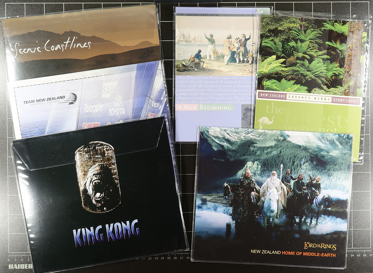 Clean collection of roughly 95 New Zealand presentation and thematic packs, 1970's-2000's, containing several hundreds of stamps, mostly sets and a few souvenir sheets in a box. The packs also include a few first day covers, postcards, and perhaps other philatelic items. Many of the sets catalogue $5 to $10 each, with the previous owner's count of usable face value postage totaling over $1,000 New Zealand dollars. A clean group, with very little if any duplication, ideal for collectors (especially for the thematic and topical content), and dealers alike. Should be worth our low estimate of roughly $3 per item. Estimate =