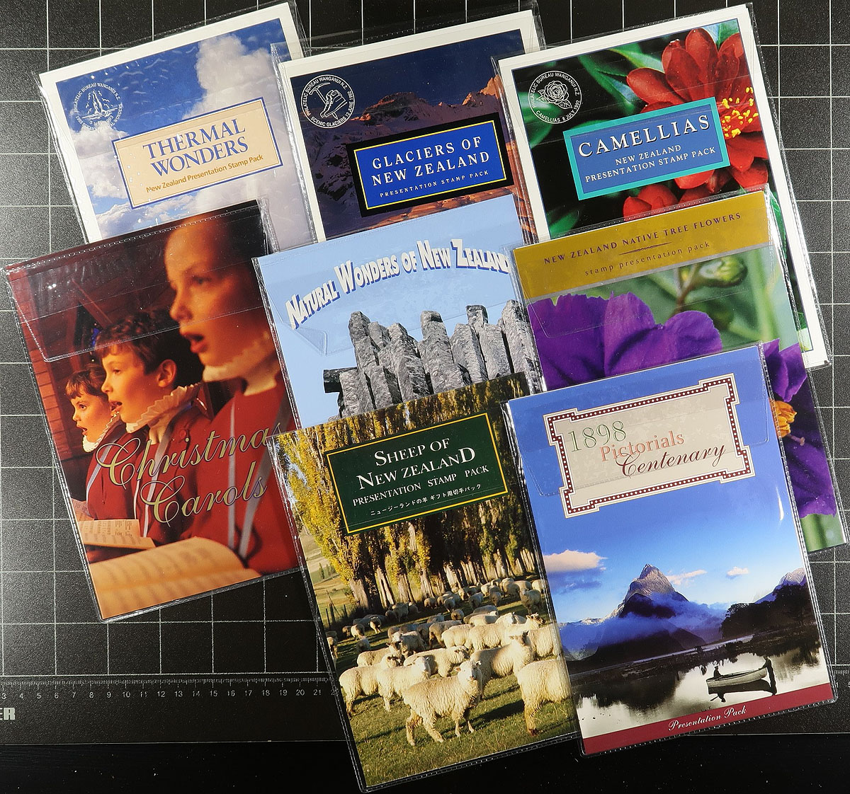 Clean collection of roughly 95 New Zealand presentation and thematic packs, 1970's-2000's, containing several hundreds of stamps, mostly sets and a few souvenir sheets in a box. The packs also include a few first day covers, postcards, and perhaps other philatelic items. Many of the sets catalogue $5 to $10 each, with the previous owner's count of usable face value postage totaling over $1,000 New Zealand dollars. A clean group, with very little if any duplication, ideal for collectors (especially for the thematic and topical content), and dealers alike. Should be worth our low estimate of roughly $3 per item. Estimate =