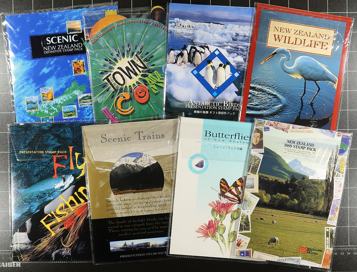 Clean collection of roughly 95 New Zealand presentation and thematic packs, 1970's-2000's, containing several hundreds of stamps, mostly sets and a few souvenir sheets in a box. The packs also include a few first day covers, postcards, and perhaps other philatelic items. Many of the sets catalogue $5 to $10 each, with the previous owner's count of usable face value postage totaling over $1,000 New Zealand dollars. A clean group, with very little if any duplication, ideal for collectors (especially for the thematic and topical content), and dealers alike. Should be worth our low estimate of roughly $3 per item. Estimate =