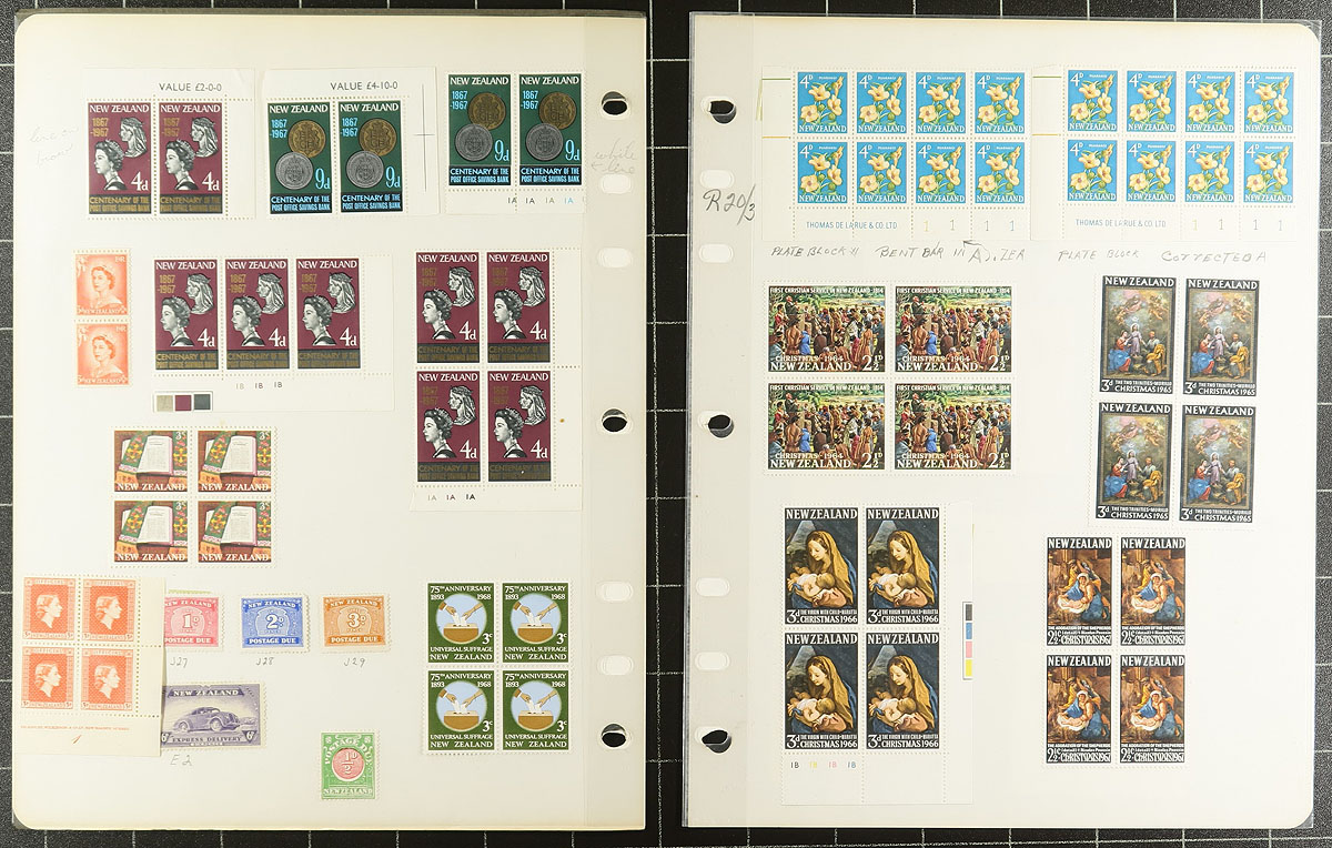 Mint collection of New Zealand, 1930's-1980's, containing roughly 950 stamps in several stock pages. The lot generally ranges from Scott #218/743, along with selections of semi-postals, and other back of the book material, souvenir sheets, plate blocks, pairs, and more. A spot check indicated some sets cataloguing $10 to $20 and up, with the owner's 2011 Scott catalogue value for the lot totals US$811.00. Face value alone would be a few hundred dollars. A nice clean lot with some mild duplication within, ideal for collectors and dealers looking for stock. Estimate =