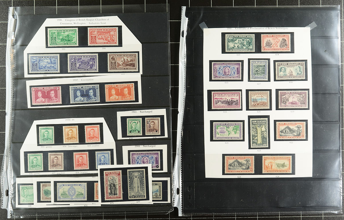 Mint collection of New Zealand, 1930's-1980's, containing roughly 950 stamps in several stock pages. The lot generally ranges from Scott #218/743, along with selections of semi-postals, and other back of the book material, souvenir sheets, plate blocks, pairs, and more. A spot check indicated some sets cataloguing $10 to $20 and up, with the owner's 2011 Scott catalogue value for the lot totals US$811.00. Face value alone would be a few hundred dollars. A nice clean lot with some mild duplication within, ideal for collectors and dealers looking for stock. Estimate =