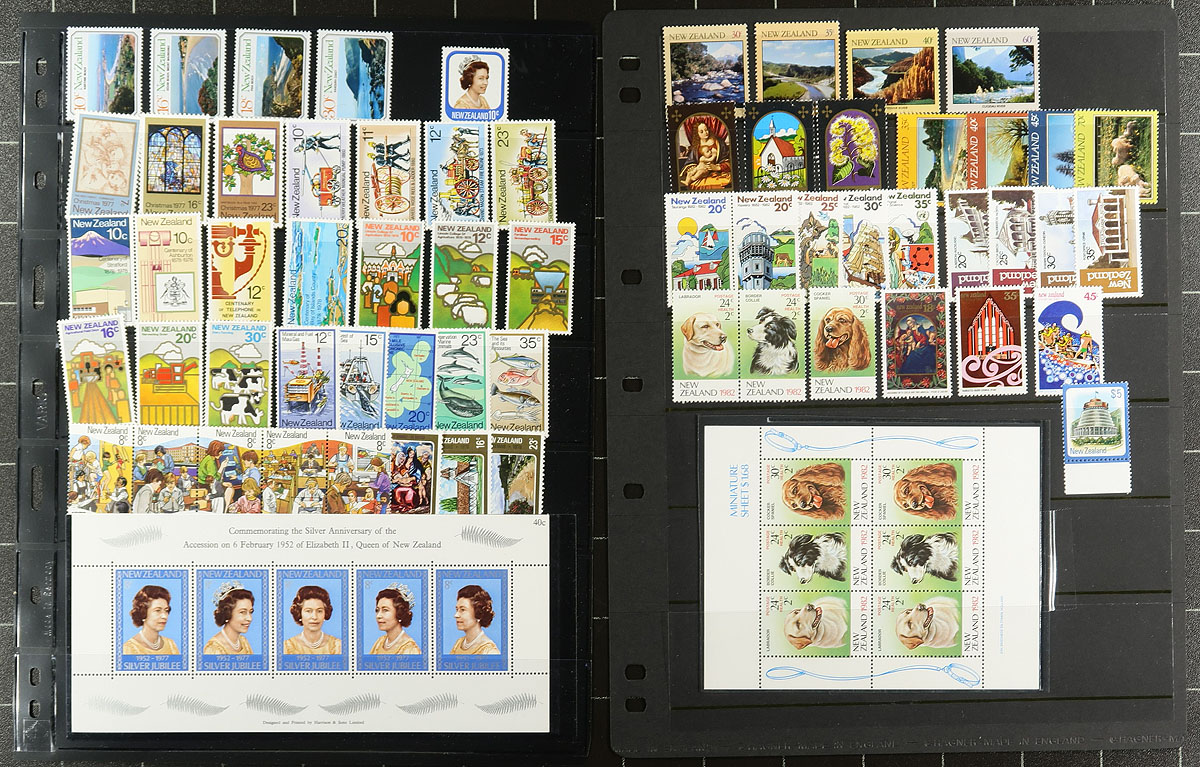 Mint collection of New Zealand, 1930's-1980's, containing roughly 950 stamps in several stock pages. The lot generally ranges from Scott #218/743, along with selections of semi-postals, and other back of the book material, souvenir sheets, plate blocks, pairs, and more. A spot check indicated some sets cataloguing $10 to $20 and up, with the owner's 2011 Scott catalogue value for the lot totals US$811.00. Face value alone would be a few hundred dollars. A nice clean lot with some mild duplication within, ideal for collectors and dealers looking for stock. Estimate =