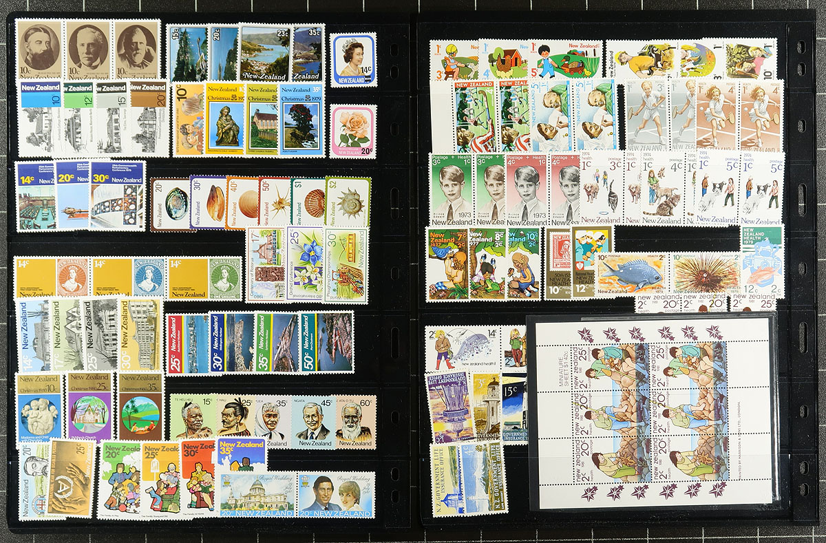 Mint collection of New Zealand, 1930's-1980's, containing roughly 950 stamps in several stock pages. The lot generally ranges from Scott #218/743, along with selections of semi-postals, and other back of the book material, souvenir sheets, plate blocks, pairs, and more. A spot check indicated some sets cataloguing $10 to $20 and up, with the owner's 2011 Scott catalogue value for the lot totals US$811.00. Face value alone would be a few hundred dollars. A nice clean lot with some mild duplication within, ideal for collectors and dealers looking for stock. Estimate =
