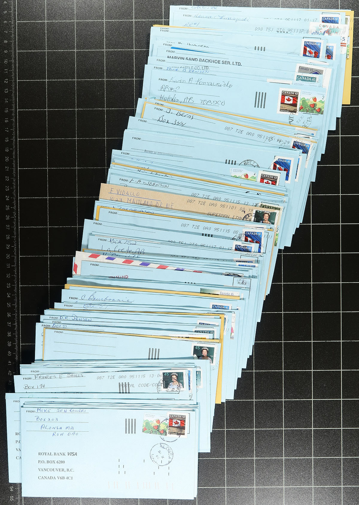 Alberta Postal History. Accumulation of roughly 600 covers collected for Alberta town postmarks, 1930's-1990's. We note roughly 200 different towns ranging from A to Y including Three Hills, Lake Louise (with a few in Chateau Lake Louise envelopes), Notikewin, New Dayton, Smoky Lake, Beiseker, Ponoka, Breton, Lacombe, and so much more. Postmark interest includes cds, split ring, MOON, Klussendorf, slogan, machine, POCON, and maybe a few other types, with some towns receiving a variety of postmarks. Almost all the mail is commercial in nature, including a few registered items, with a mix of regular and #10 sized envelopes, noting some faults with a few of the covers. A nice lot for the Alberta or Canada postmark collector, overall fine to very fine. Estimate =