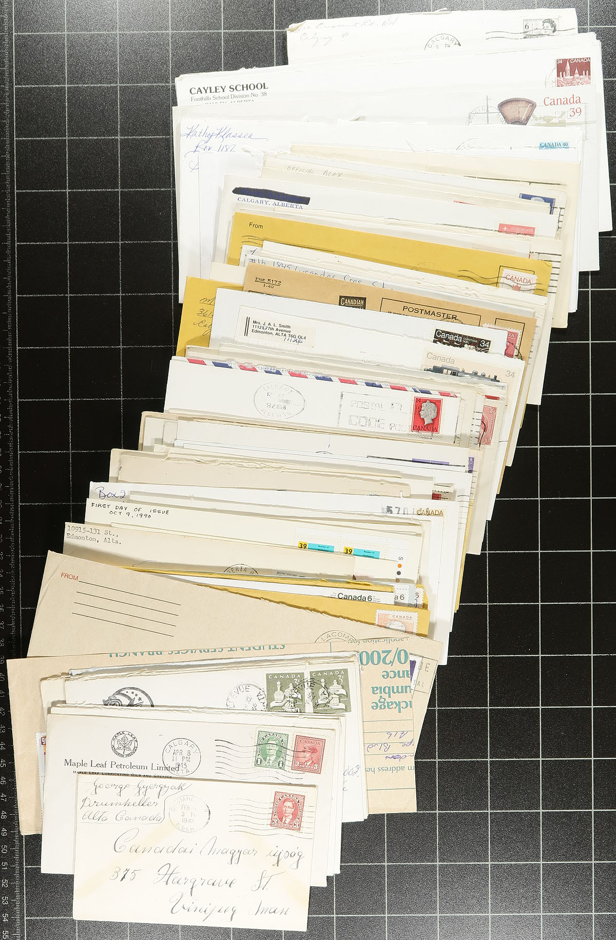 Alberta Postal History. Accumulation of roughly 600 covers collected for Alberta town postmarks, 1930's-1990's. We note roughly 200 different towns ranging from A to Y including Three Hills, Lake Louise (with a few in Chateau Lake Louise envelopes), Notikewin, New Dayton, Smoky Lake, Beiseker, Ponoka, Breton, Lacombe, and so much more. Postmark interest includes cds, split ring, MOON, Klussendorf, slogan, machine, POCON, and maybe a few other types, with some towns receiving a variety of postmarks. Almost all the mail is commercial in nature, including a few registered items, with a mix of regular and #10 sized envelopes, noting some faults with a few of the covers. A nice lot for the Alberta or Canada postmark collector, overall fine to very fine. Estimate =
