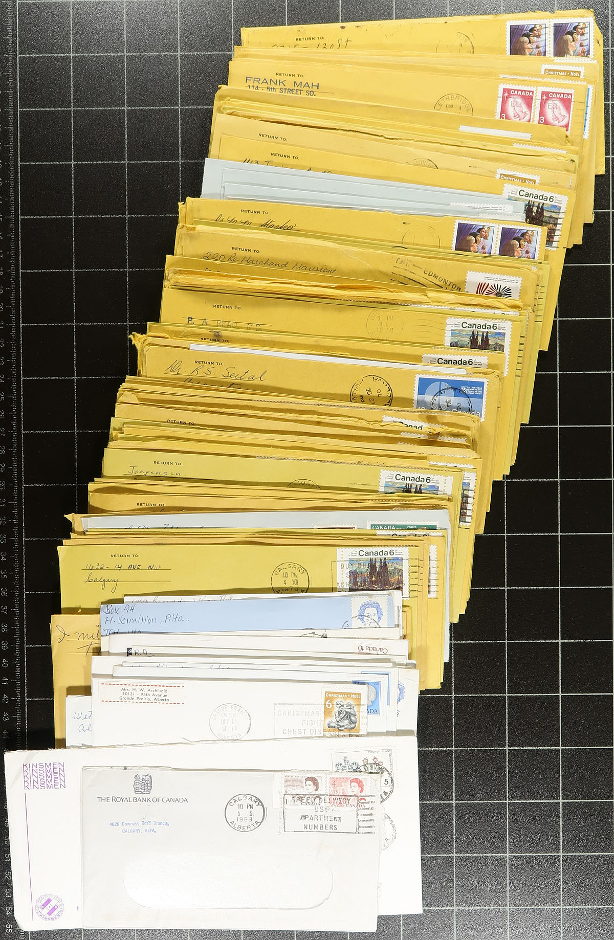 Alberta Postal History. Accumulation of roughly 600 covers collected for Alberta town postmarks, 1930's-1990's. We note roughly 200 different towns ranging from A to Y including Three Hills, Lake Louise (with a few in Chateau Lake Louise envelopes), Notikewin, New Dayton, Smoky Lake, Beiseker, Ponoka, Breton, Lacombe, and so much more. Postmark interest includes cds, split ring, MOON, Klussendorf, slogan, machine, POCON, and maybe a few other types, with some towns receiving a variety of postmarks. Almost all the mail is commercial in nature, including a few registered items, with a mix of regular and #10 sized envelopes, noting some faults with a few of the covers. A nice lot for the Alberta or Canada postmark collector, overall fine to very fine. Estimate =