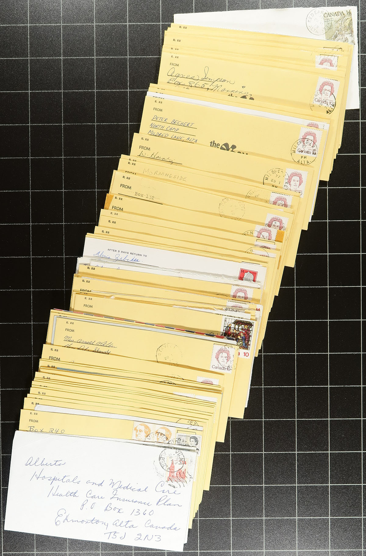 Alberta Postal History. Accumulation of roughly 600 covers collected for Alberta town postmarks, 1930's-1990's. We note roughly 200 different towns ranging from A to Y including Three Hills, Lake Louise (with a few in Chateau Lake Louise envelopes), Notikewin, New Dayton, Smoky Lake, Beiseker, Ponoka, Breton, Lacombe, and so much more. Postmark interest includes cds, split ring, MOON, Klussendorf, slogan, machine, POCON, and maybe a few other types, with some towns receiving a variety of postmarks. Almost all the mail is commercial in nature, including a few registered items, with a mix of regular and #10 sized envelopes, noting some faults with a few of the covers. A nice lot for the Alberta or Canada postmark collector, overall fine to very fine. Estimate =