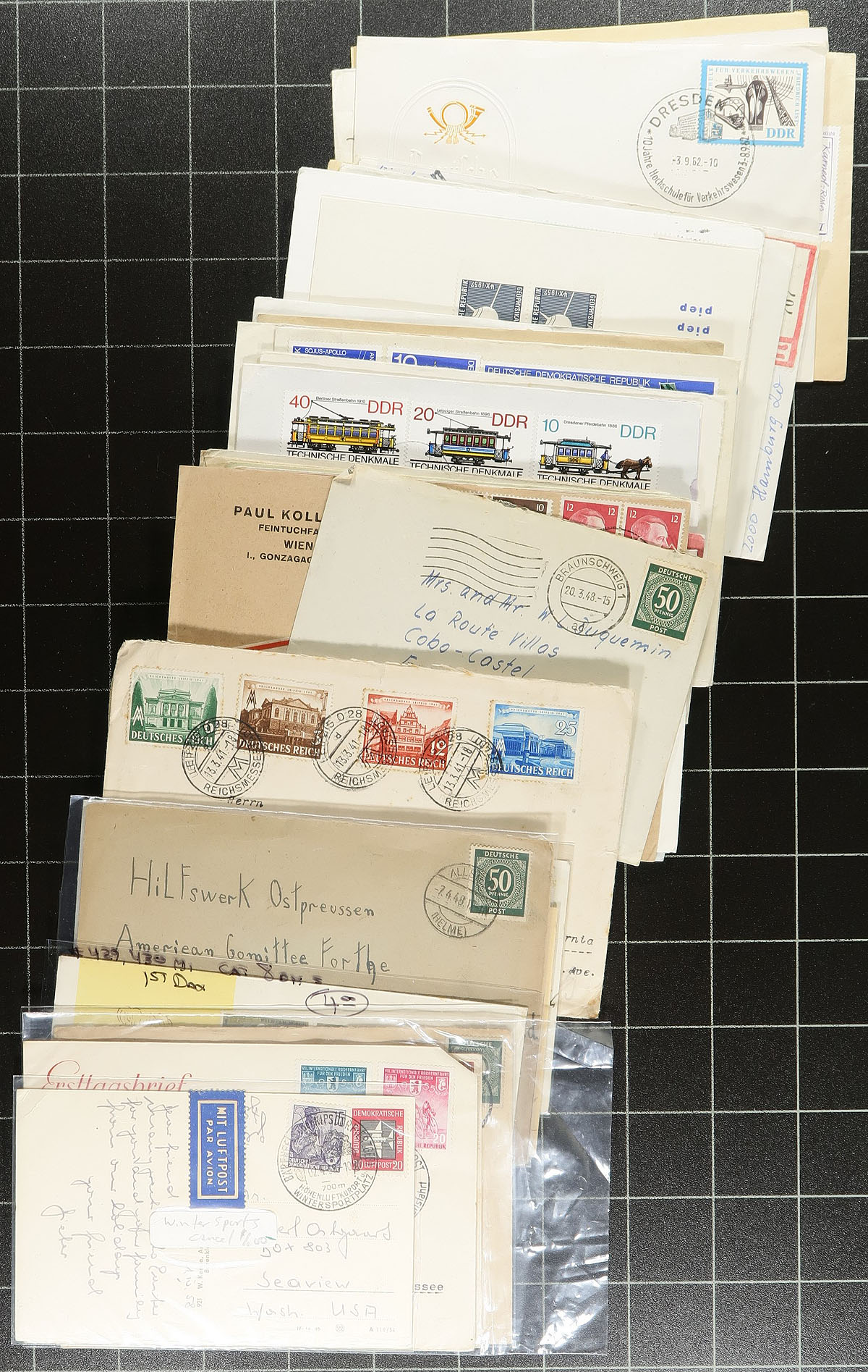 Accumulation of roughly 400 Germany covers and cards, 1870's-1990's, loose in a box. We note a good variety of items, represented from Germany, DDR and a few from Berlin, including postal stationery (noting some from German States), postcards, first day covers, commercial mail, registered letters, and more. We encountered mostly sets frankings from the 1950's onwards including a wide variety of topical or thematic subjects including Olympics, sports, space, Leipzig Fair, and more. Postmark interest includes cds, bridge, pictorial, and a few other types. A nice lot for the Germany or worldwide collector. A few faults with a few of the covers, overall fine to very fine. Estimate =