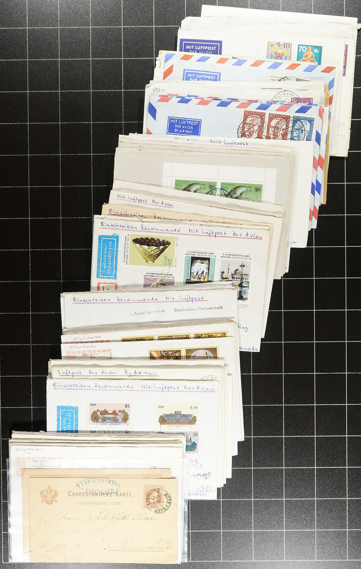 Accumulation of roughly 400 Germany covers and cards, 1870's-1990's, loose in a box. We note a good variety of items, represented from Germany, DDR and a few from Berlin, including postal stationery (noting some from German States), postcards, first day covers, commercial mail, registered letters, and more. We encountered mostly sets frankings from the 1950's onwards including a wide variety of topical or thematic subjects including Olympics, sports, space, Leipzig Fair, and more. Postmark interest includes cds, bridge, pictorial, and a few other types. A nice lot for the Germany or worldwide collector. A few faults with a few of the covers, overall fine to very fine. Estimate =
