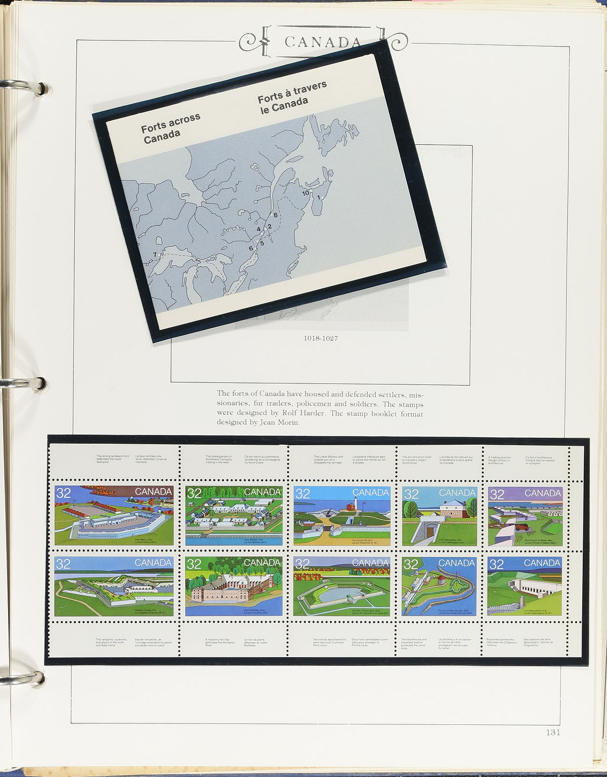 Collection of never hinged stamps in a Darnell stamp album, 1972-1990. The collection contains several hundred stamps, including coil pairs, plate blocks, and a few booklets, generally ranging from Unitrade #586/1301. The collection contains a few items cataloguing $10 and up, with a face value of $270.00. The pages of the album have a bit odour from storage, but the stamps are in hingeless mounts and appear to be unaffected. A good lot as a starter never hinged collection, or for the postage value. Estimate =