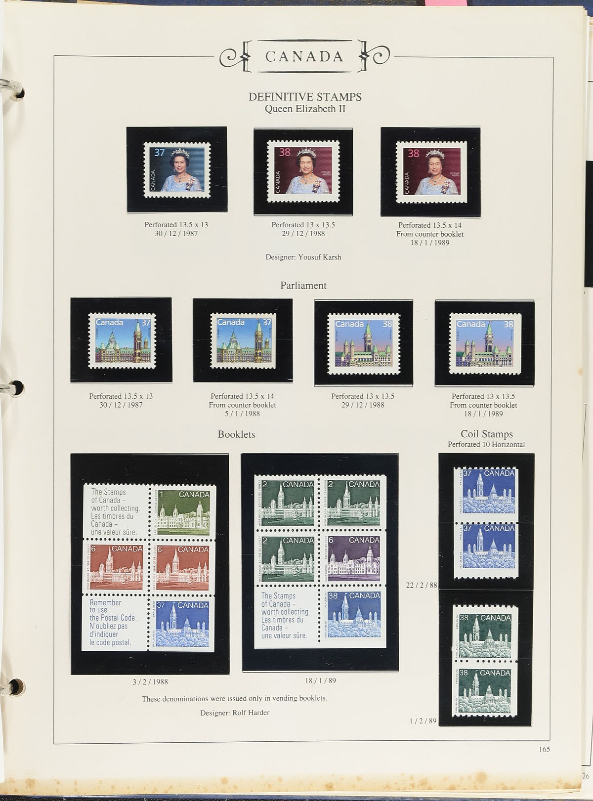 Collection of never hinged stamps in a Darnell stamp album, 1972-1990. The collection contains several hundred stamps, including coil pairs, plate blocks, and a few booklets, generally ranging from Unitrade #586/1301. The collection contains a few items cataloguing $10 and up, with a face value of $270.00. The pages of the album have a bit odour from storage, but the stamps are in hingeless mounts and appear to be unaffected. A good lot as a starter never hinged collection, or for the postage value. Estimate =