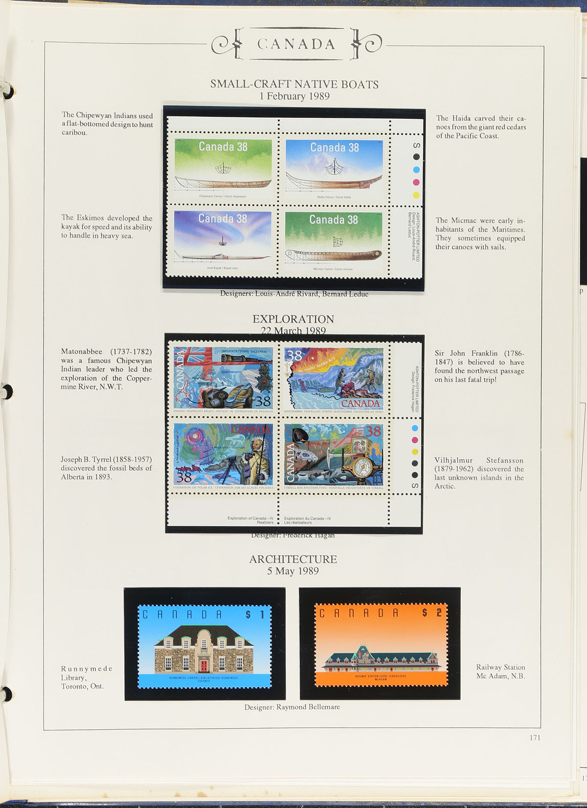 Collection of never hinged stamps in a Darnell stamp album, 1972-1990. The collection contains several hundred stamps, including coil pairs, plate blocks, and a few booklets, generally ranging from Unitrade #586/1301. The collection contains a few items cataloguing $10 and up, with a face value of $270.00. The pages of the album have a bit odour from storage, but the stamps are in hingeless mounts and appear to be unaffected. A good lot as a starter never hinged collection, or for the postage value. Estimate =
