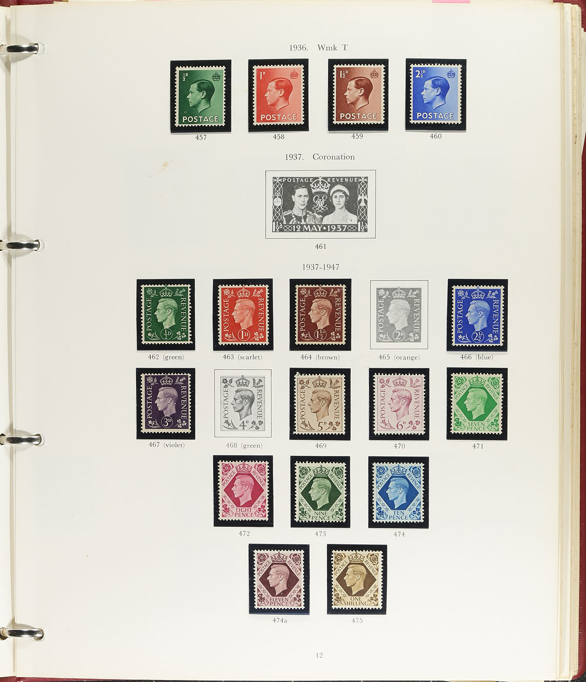Fine collection of mint Great Britain, 1924-1989, containing many hundreds of stamps all in hingeless mounts in a Stanley Gibbons album. This neatly organized collection generally ranges from Scott #185/1284, including a very good representation of Machins in period, and a few souvenir sheets. A spot check indicated a mix of hinged and never hinged material up to the 1960's, with never hinged material post 1970, noting 98% completion from 1972 to 1989. We note a few better items with #s 251A, 275 (nh, $75 total), 286-289 (lh, $80 total), 292-308 (lh, $101 total), along with a few sets cataloging $10 and up each, with face value estimated to be in the £75 to £100 range. A nice starter collection with some better material within, a slight odor on the pages from storage, but does not appear to affect the stamps, overall fine to very fine. Estimate =