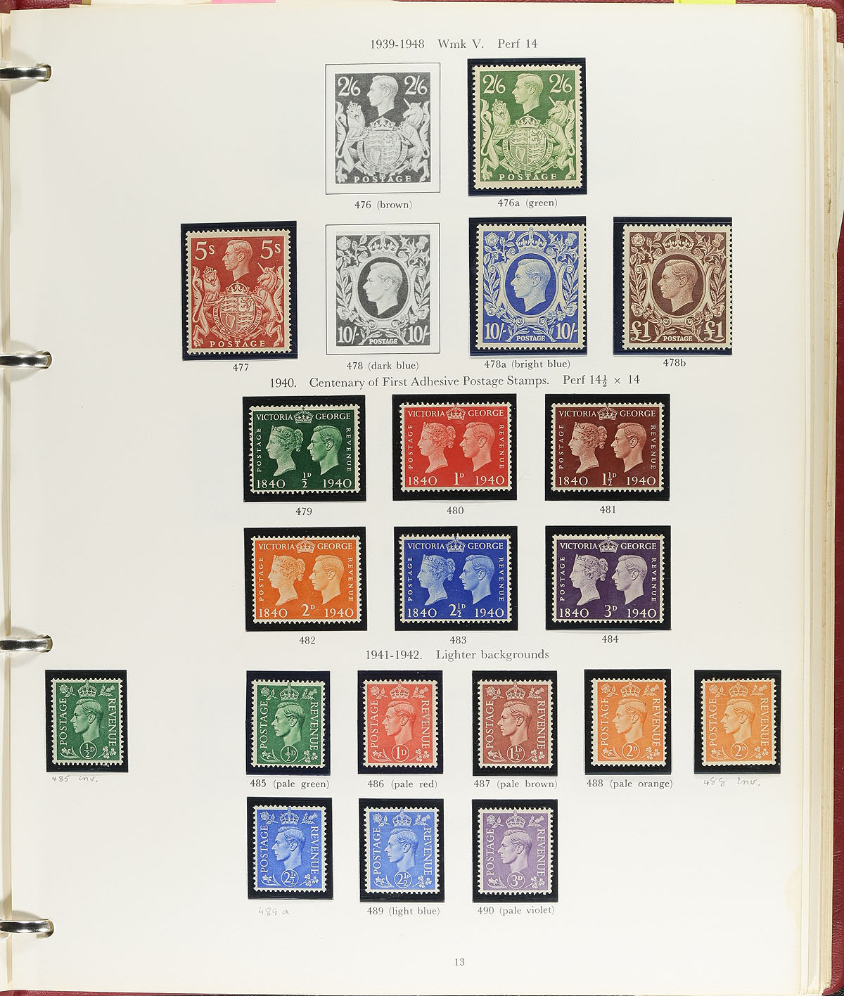 Fine collection of mint Great Britain, 1924-1989, containing many hundreds of stamps all in hingeless mounts in a Stanley Gibbons album. This neatly organized collection generally ranges from Scott #185/1284, including a very good representation of Machins in period, and a few souvenir sheets. A spot check indicated a mix of hinged and never hinged material up to the 1960's, with never hinged material post 1970, noting 98% completion from 1972 to 1989. We note a few better items with #s 251A, 275 (nh, $75 total), 286-289 (lh, $80 total), 292-308 (lh, $101 total), along with a few sets cataloging $10 and up each, with face value estimated to be in the £75 to £100 range. A nice starter collection with some better material within, a slight odor on the pages from storage, but does not appear to affect the stamps, overall fine to very fine. Estimate =