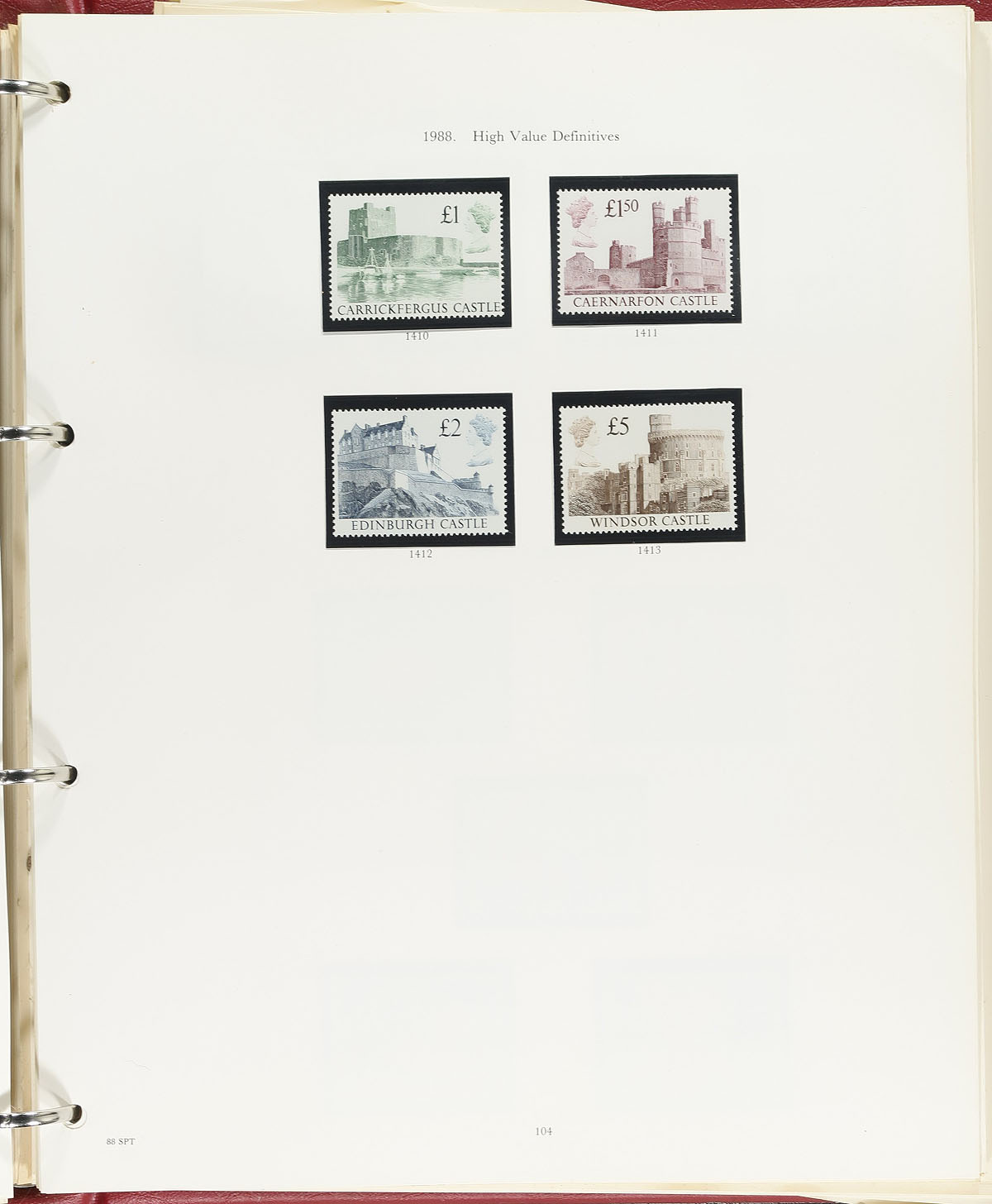 Fine collection of mint Great Britain, 1924-1989, containing many hundreds of stamps all in hingeless mounts in a Stanley Gibbons album. This neatly organized collection generally ranges from Scott #185/1284, including a very good representation of Machins in period, and a few souvenir sheets. A spot check indicated a mix of hinged and never hinged material up to the 1960's, with never hinged material post 1970, noting 98% completion from 1972 to 1989. We note a few better items with #s 251A, 275 (nh, $75 total), 286-289 (lh, $80 total), 292-308 (lh, $101 total), along with a few sets cataloging $10 and up each, with face value estimated to be in the £75 to £100 range. A nice starter collection with some better material within, a slight odor on the pages from storage, but does not appear to affect the stamps, overall fine to very fine. Estimate =