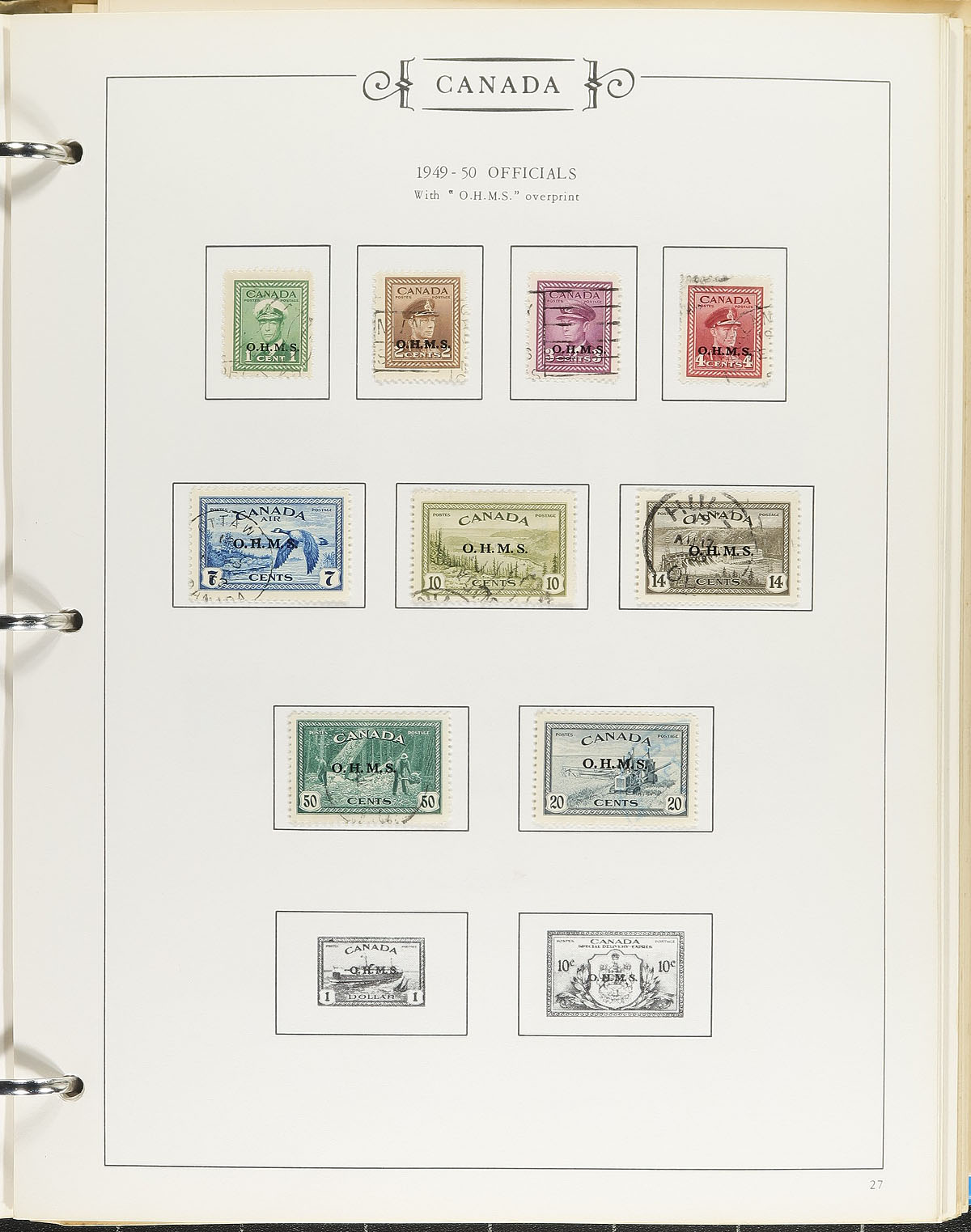 Fine collection of used Canada, 1859-1989, containing many hundreds of stamps in a Darnell album. This neatly organized collection generally ranges from Scott #14/1263 (includes a faulty #4 imperforate beaver), including selections of back of the book issues. A check of early issues includes #s 14-15, 17-19, Large Queens #s 21, 24, 25, 27-29 (most with small faults), 17 Small Queens (including 10c, 20c, 50c), small selection of Jubilees (noting 50c), part sets of Leafs and Numerals, Quebecs, Scrolls (includes 50c Bluenose and $1 Parliament), and complete sets of Admirals, Pictorial issues, War and Peace issues. A spot check indicated singles, sets, and partial sets cataloguing $20 to $50 and up, including #O9 (c.v. $110), O25 ($70). Postmark interest includes cds, broken circles, a few squared circles and more, noting a few 'socked on the nose' town cancels. A very nice collection that should be continued, a slight odor on the pages from storage, but does not appear to affect the stamps, still a fine to very fine collection. Estimate =