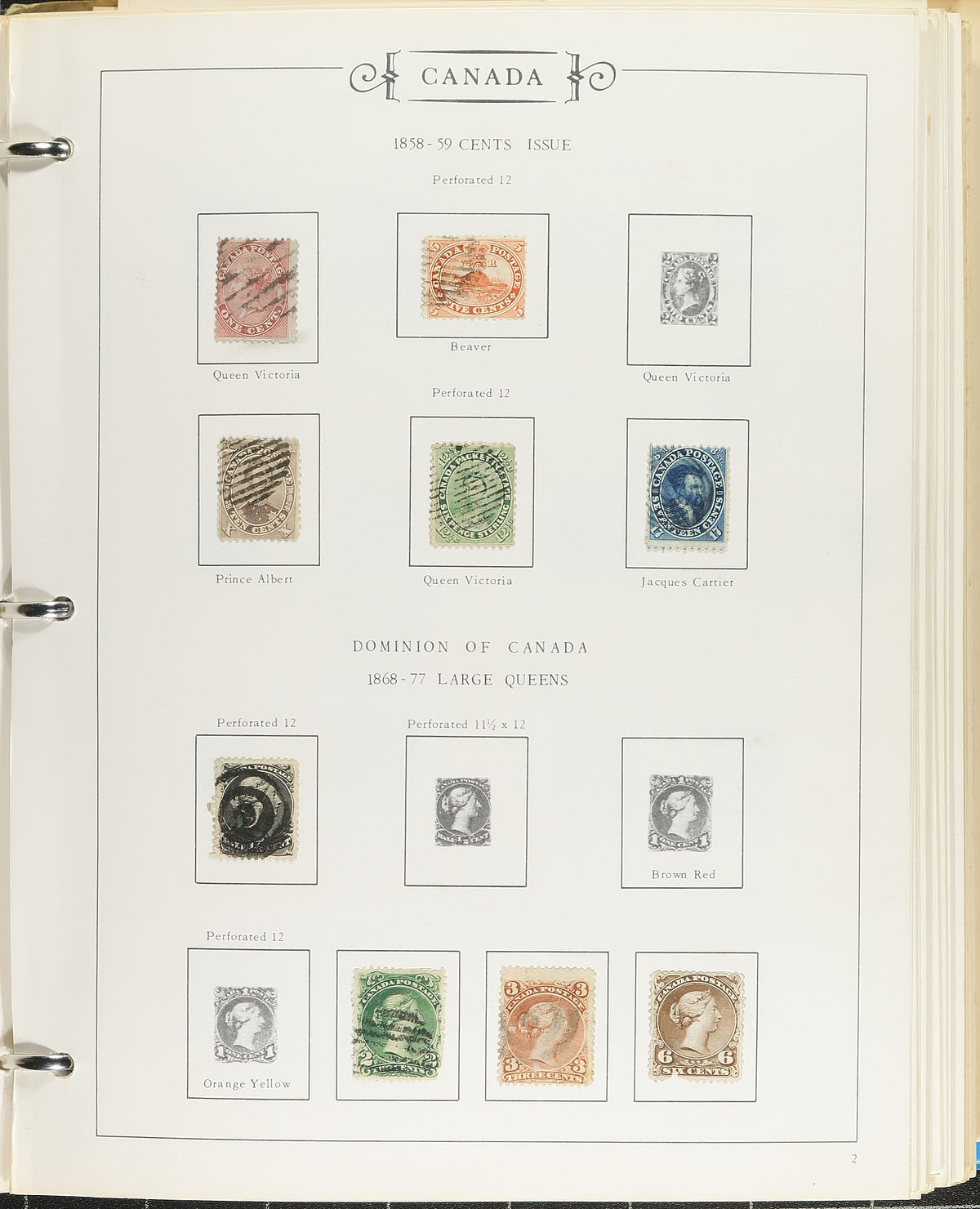 Fine collection of used Canada, 1859-1989, containing many hundreds of stamps in a Darnell album. This neatly organized collection generally ranges from Scott #14/1263 (includes a faulty #4 imperforate beaver), including selections of back of the book issues. A check of early issues includes #s 14-15, 17-19, Large Queens #s 21, 24, 25, 27-29 (most with small faults), 17 Small Queens (including 10c, 20c, 50c), small selection of Jubilees (noting 50c), part sets of Leafs and Numerals, Quebecs, Scrolls (includes 50c Bluenose and $1 Parliament), and complete sets of Admirals, Pictorial issues, War and Peace issues. A spot check indicated singles, sets, and partial sets cataloguing $20 to $50 and up, including #O9 (c.v. $110), O25 ($70). Postmark interest includes cds, broken circles, a few squared circles and more, noting a few 'socked on the nose' town cancels. A very nice collection that should be continued, a slight odor on the pages from storage, but does not appear to affect the stamps, still a fine to very fine collection. Estimate =
