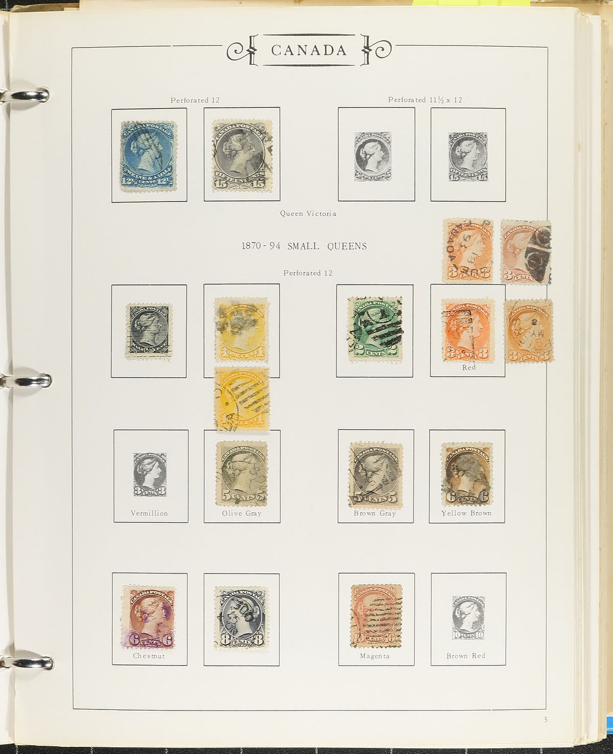 Fine collection of used Canada, 1859-1989, containing many hundreds of stamps in a Darnell album. This neatly organized collection generally ranges from Scott #14/1263 (includes a faulty #4 imperforate beaver), including selections of back of the book issues. A check of early issues includes #s 14-15, 17-19, Large Queens #s 21, 24, 25, 27-29 (most with small faults), 17 Small Queens (including 10c, 20c, 50c), small selection of Jubilees (noting 50c), part sets of Leafs and Numerals, Quebecs, Scrolls (includes 50c Bluenose and $1 Parliament), and complete sets of Admirals, Pictorial issues, War and Peace issues. A spot check indicated singles, sets, and partial sets cataloguing $20 to $50 and up, including #O9 (c.v. $110), O25 ($70). Postmark interest includes cds, broken circles, a few squared circles and more, noting a few 'socked on the nose' town cancels. A very nice collection that should be continued, a slight odor on the pages from storage, but does not appear to affect the stamps, still a fine to very fine collection. Estimate =
