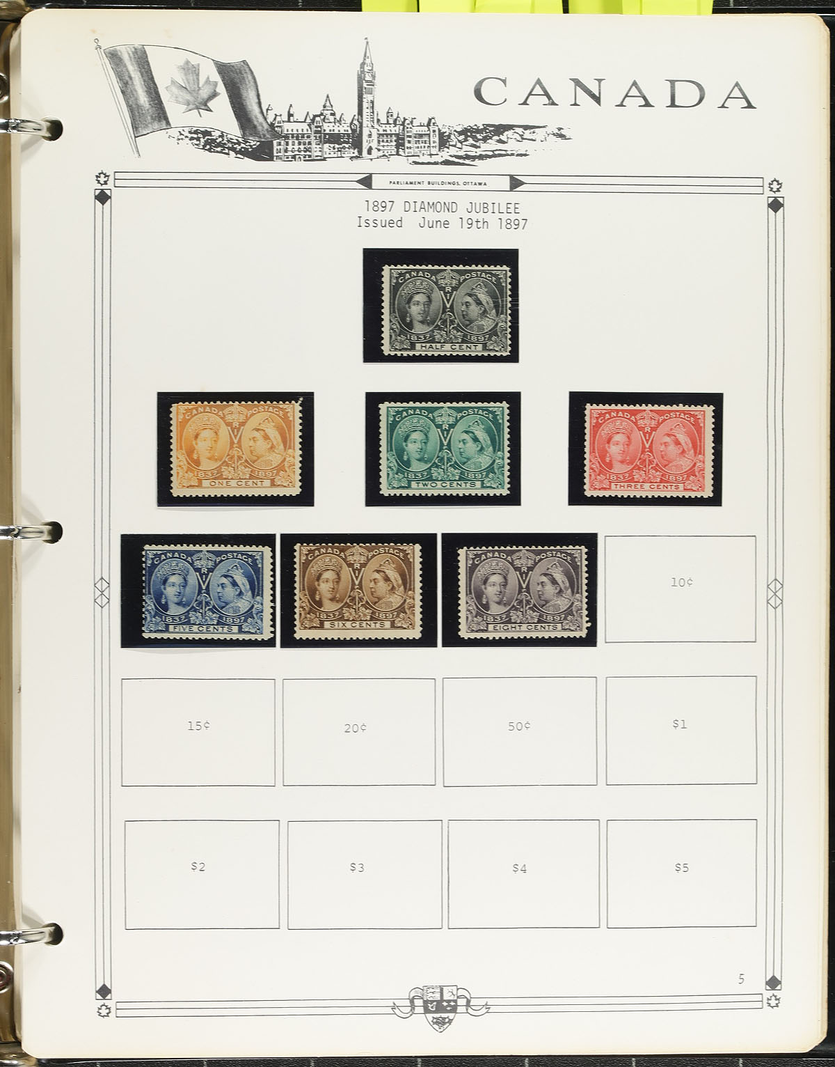 Collection of mint Canada, 1897-1972, containing a few hundred stamps all in hingeless mounts in a Parliament album. The collection generally ranges from Scott #50/550 (does include #s 15, 34, 35, with varying faults, not considered), along with selections of back of the book issues. We note a few better issues including Jubilees 1/2c to 8c, 5c Edward, a few Admirals including #s 111, 119 (mh, $320 total), along with a few stamps and sets cataloguing $10 and up. A spot check indicated primarily hinged material, along with a few no gum stamps, with never hinged material possible post 1950. A good starter mint collection, a few faults with the early issues, noting a slight odor on the pages from storage, but does not appear to affect the stamps, overall fine to very fine. Estimate =