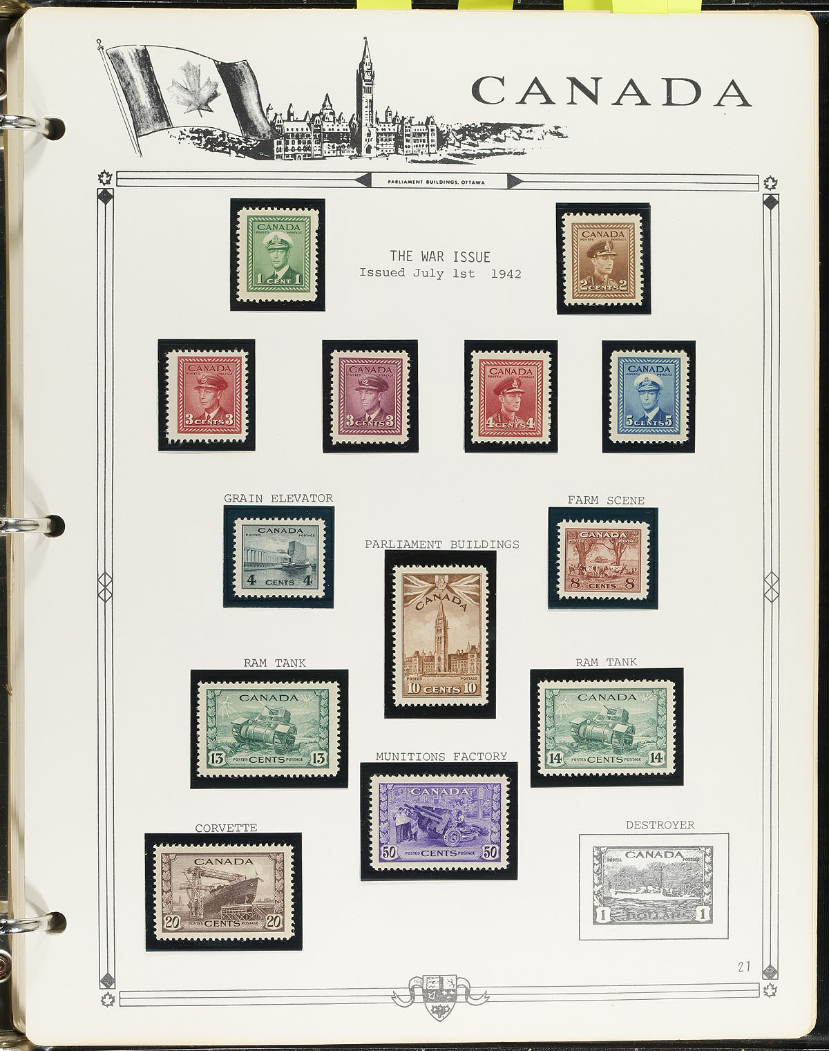 Collection of mint Canada, 1897-1972, containing a few hundred stamps all in hingeless mounts in a Parliament album. The collection generally ranges from Scott #50/550 (does include #s 15, 34, 35, with varying faults, not considered), along with selections of back of the book issues. We note a few better issues including Jubilees 1/2c to 8c, 5c Edward, a few Admirals including #s 111, 119 (mh, $320 total), along with a few stamps and sets cataloguing $10 and up. A spot check indicated primarily hinged material, along with a few no gum stamps, with never hinged material possible post 1950. A good starter mint collection, a few faults with the early issues, noting a slight odor on the pages from storage, but does not appear to affect the stamps, overall fine to very fine. Estimate =