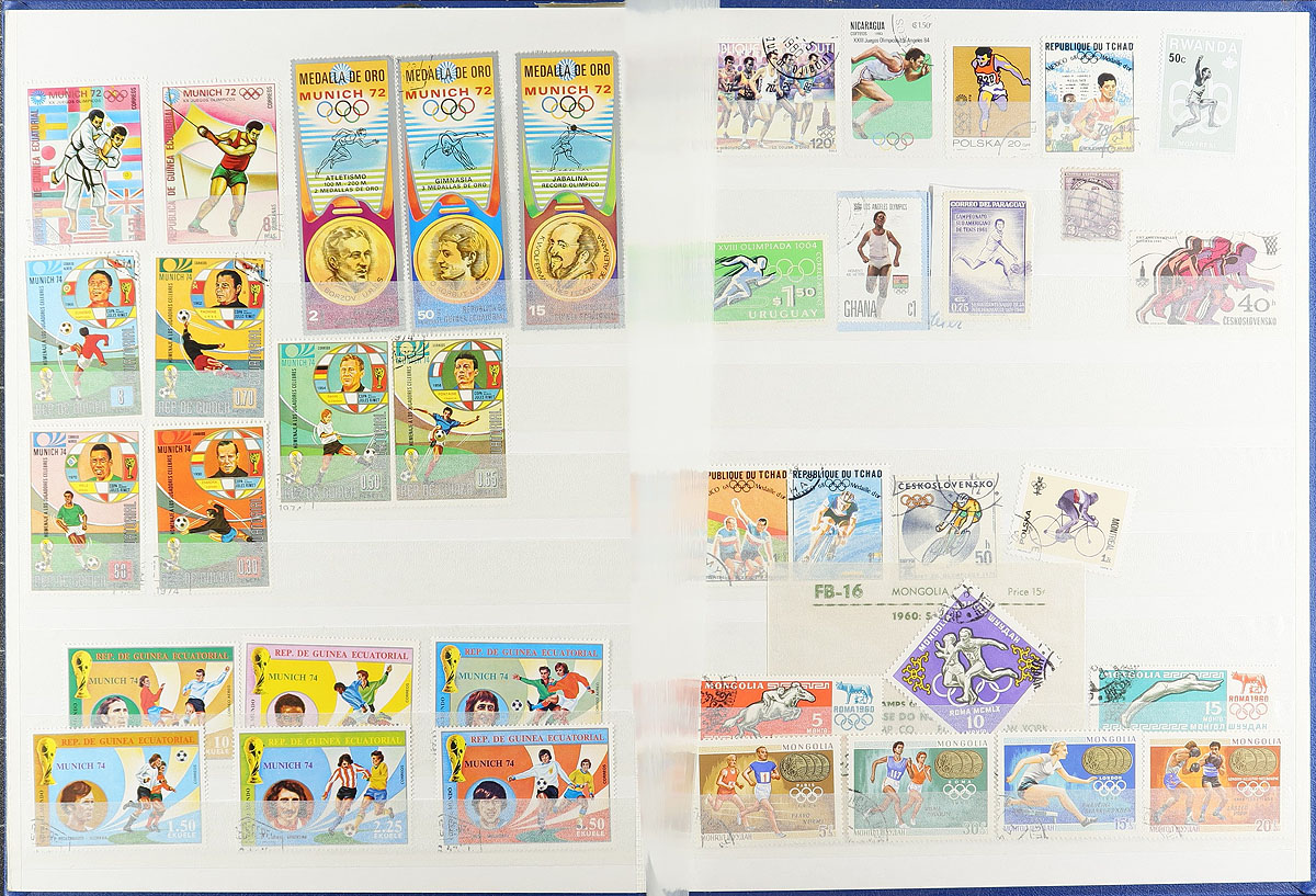 Lovely collection of sports related stamps and covers, containing many hundreds of items in a variety of formats including the Philatelic Tribute to the 1988 Olympic Games, Winter Olympic Games (2 volumes with hundreds of stamps and covers), 1980 Olympic first day covers, two stockbooks full of stamps and souvenir sheets, and a small plastic bag with sports related souvenir sheets. A nice lot for the sports and Olympics enthusiast, ideal for topical and thematic collectors, overall fine to very fine. Estimate =