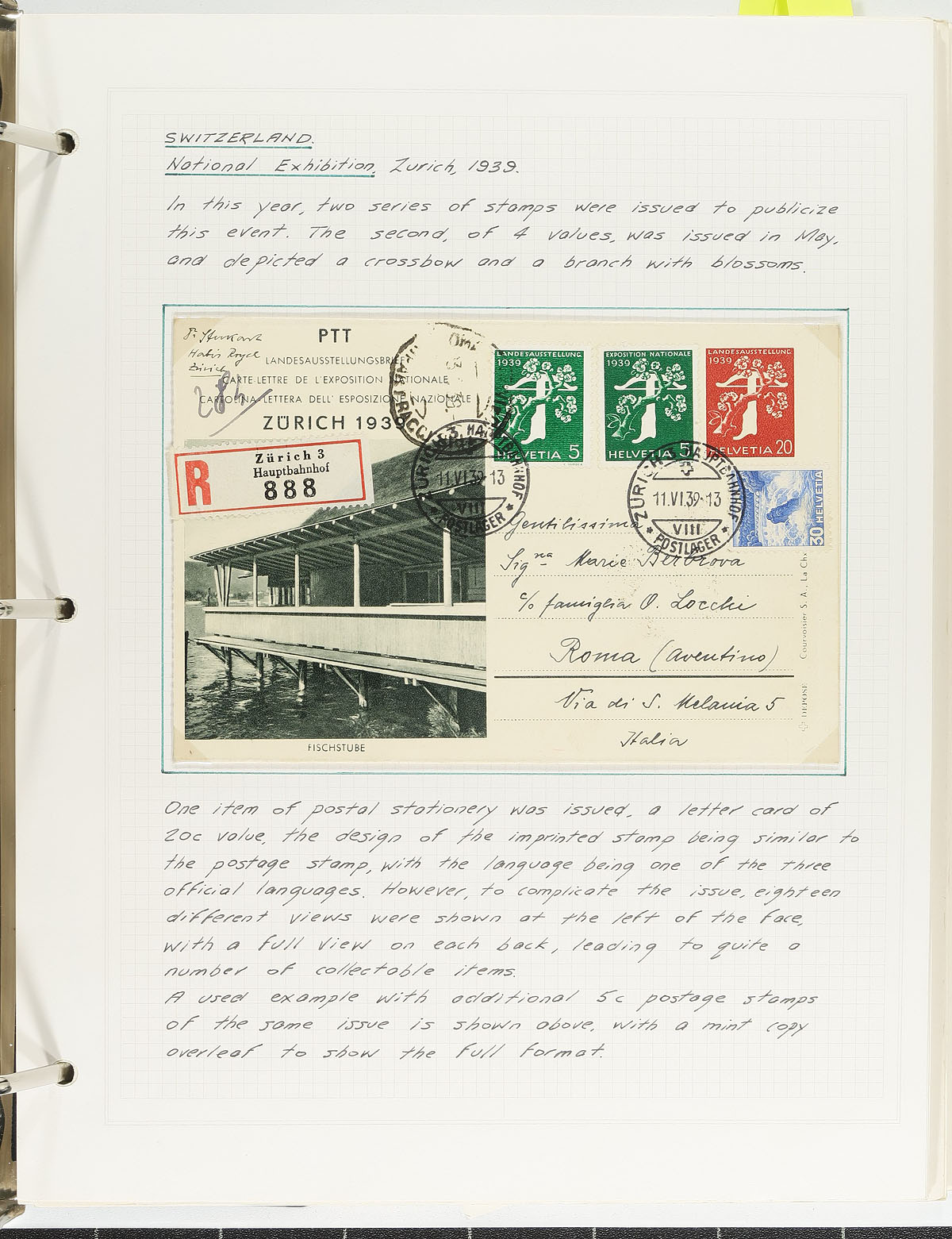 Postal History. Intriguing collection of Switzerland postal stationery, 1915-1994, containing 73 items neatly written up on pages for various exhibitions (from Pipex 1979 to 1994). We note used and unused items including for special events, private and official postcards, first flights and more. All of the items are well identified with the occasional write up by the owner. We note some items that would retail $10 to $20 today, with the owner's 2003 Michel catalogue value for the lot totaling 179.00 Euros. A nice specialty lot and an exhibit that should be expanded, overall fine to very fine. Estimate =