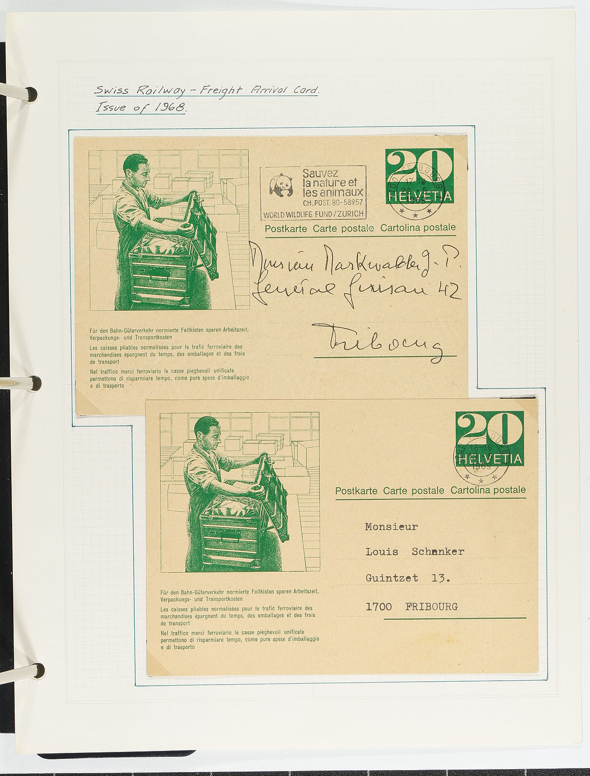 Postal History. Intriguing collection of Switzerland postal stationery, 1915-1994, containing 73 items neatly written up on pages for various exhibitions (from Pipex 1979 to 1994). We note used and unused items including for special events, private and official postcards, first flights and more. All of the items are well identified with the occasional write up by the owner. We note some items that would retail $10 to $20 today, with the owner's 2003 Michel catalogue value for the lot totaling 179.00 Euros. A nice specialty lot and an exhibit that should be expanded, overall fine to very fine. Estimate =