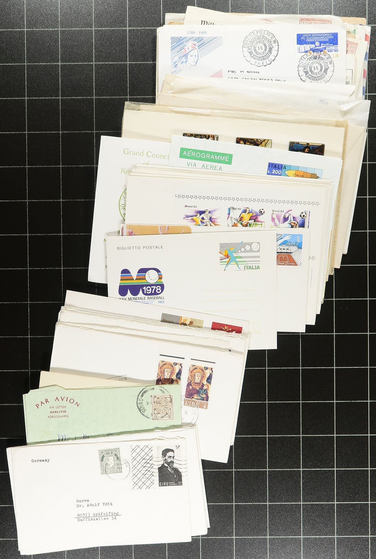 Accumulation of roughly 450 covers and cards in a small plastic tub. A cursory check indicated mostly European material, noting better representation from Netherlands, Great Britain, Liechtenstein, along with Singapore, British Commonwealth and a few other regions. The majority of material appear to be first day covers, with singles, sets, and souvenir sheet frankings, including several suitable thematic and topical subjects, along with postal stationery, event covers, etc. A few items retail between $5 and $10, including a few Great Britain numismatic covers, some Singapore items, and probably more. A nice lot for collectors and show dealers looking to fill up dollar boxes, overall very fine. Estimate =