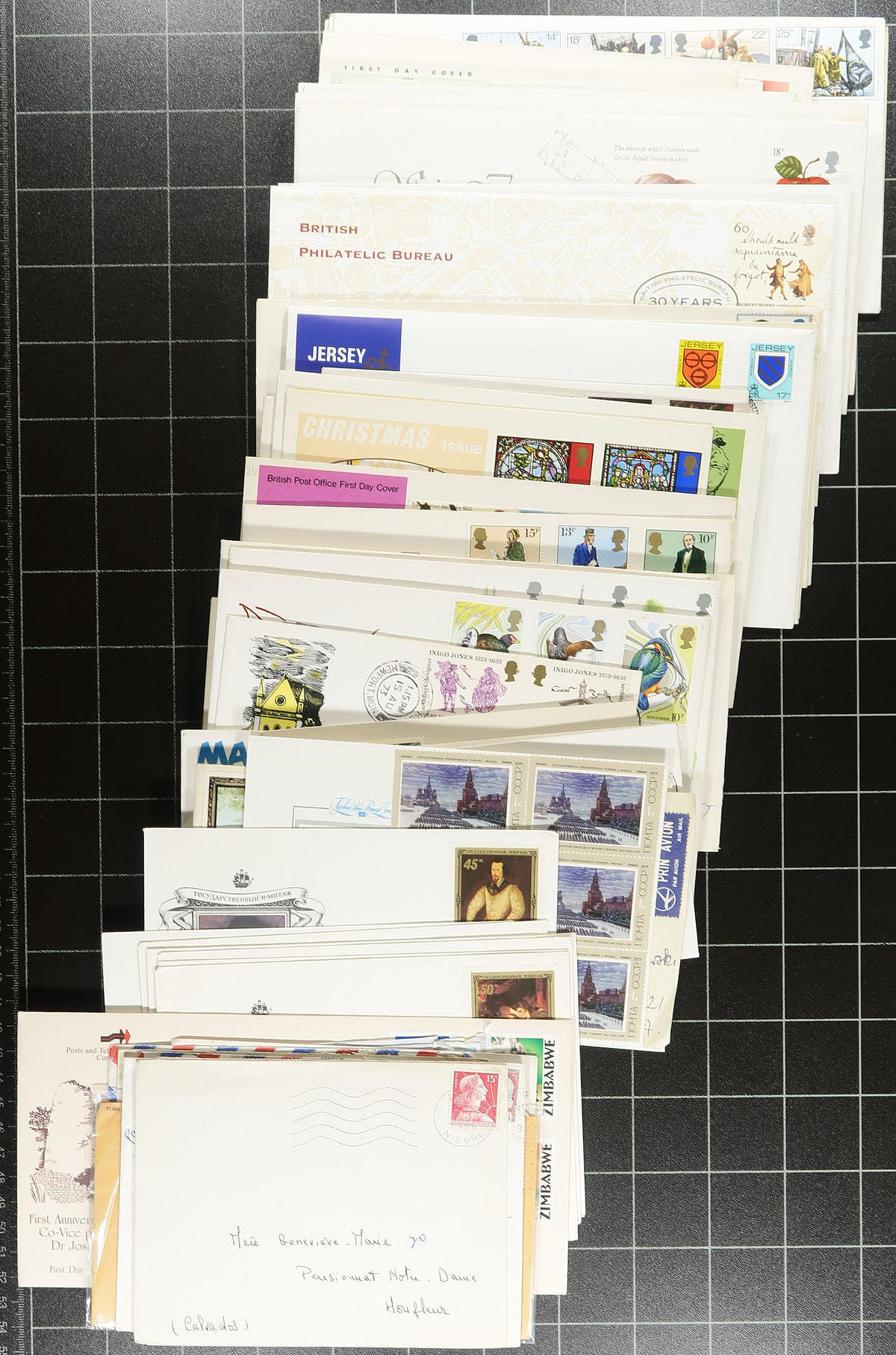 Accumulation of roughly 450 covers and cards in a small plastic tub. A cursory check indicated mostly European material, noting better representation from Netherlands, Great Britain, Liechtenstein, along with Singapore, British Commonwealth and a few other regions. The majority of material appear to be first day covers, with singles, sets, and souvenir sheet frankings, including several suitable thematic and topical subjects, along with postal stationery, event covers, etc. A few items retail between $5 and $10, including a few Great Britain numismatic covers, some Singapore items, and probably more. A nice lot for collectors and show dealers looking to fill up dollar boxes, overall very fine. Estimate =