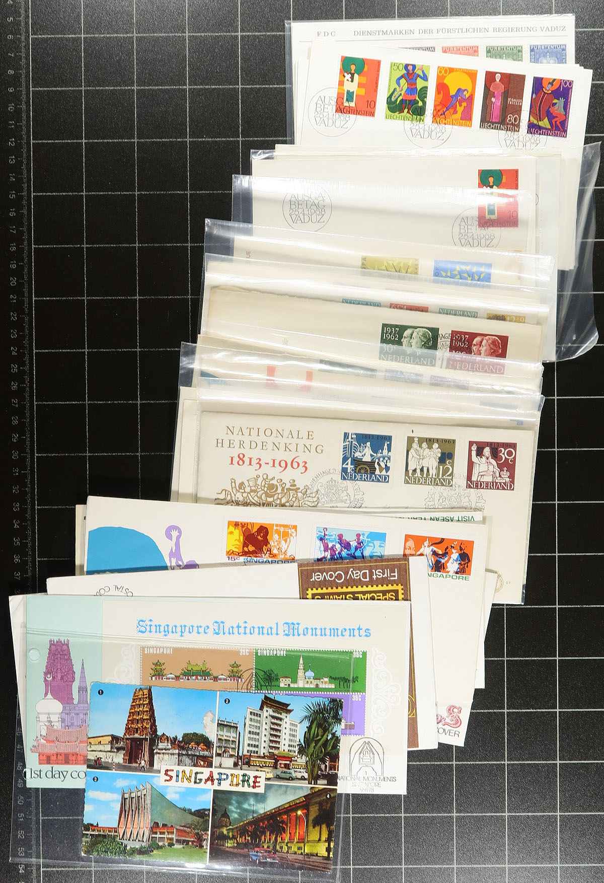 Accumulation of roughly 450 covers and cards in a small plastic tub. A cursory check indicated mostly European material, noting better representation from Netherlands, Great Britain, Liechtenstein, along with Singapore, British Commonwealth and a few other regions. The majority of material appear to be first day covers, with singles, sets, and souvenir sheet frankings, including several suitable thematic and topical subjects, along with postal stationery, event covers, etc. A few items retail between $5 and $10, including a few Great Britain numismatic covers, some Singapore items, and probably more. A nice lot for collectors and show dealers looking to fill up dollar boxes, overall very fine. Estimate =