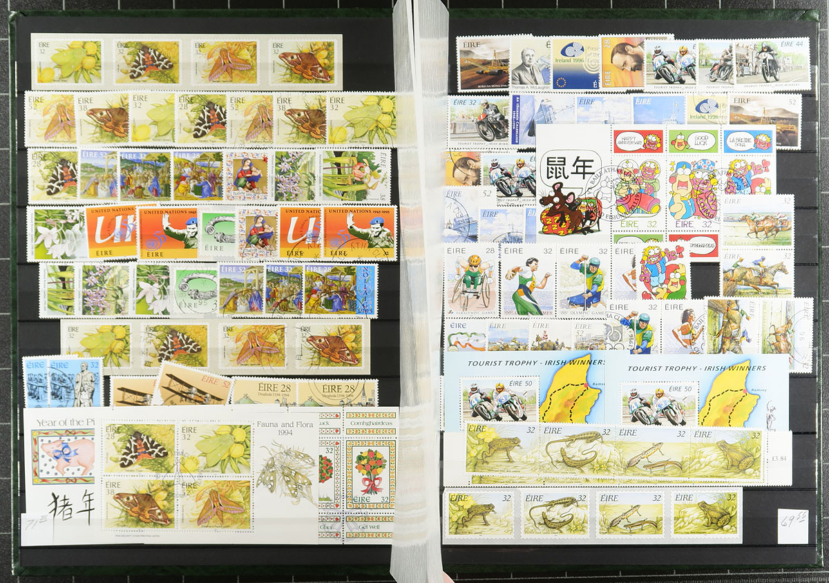 Comprehensive collection of never hinged and used Ireland, 1990-2001, containing many hundreds of stamps neatly arranged in a stockbook. The collection generally ranges from Scott #767/1339, seemingly containing a mint and a used (post office cto cancel), example for the majority of issues, including souvenir sheets, self-adhesive singles and strips, etc. A period of which the issues add up quickly in the catalogue! A very nice collection that should be continued, overall very fine. 2026 Scott US$1,558.00 =