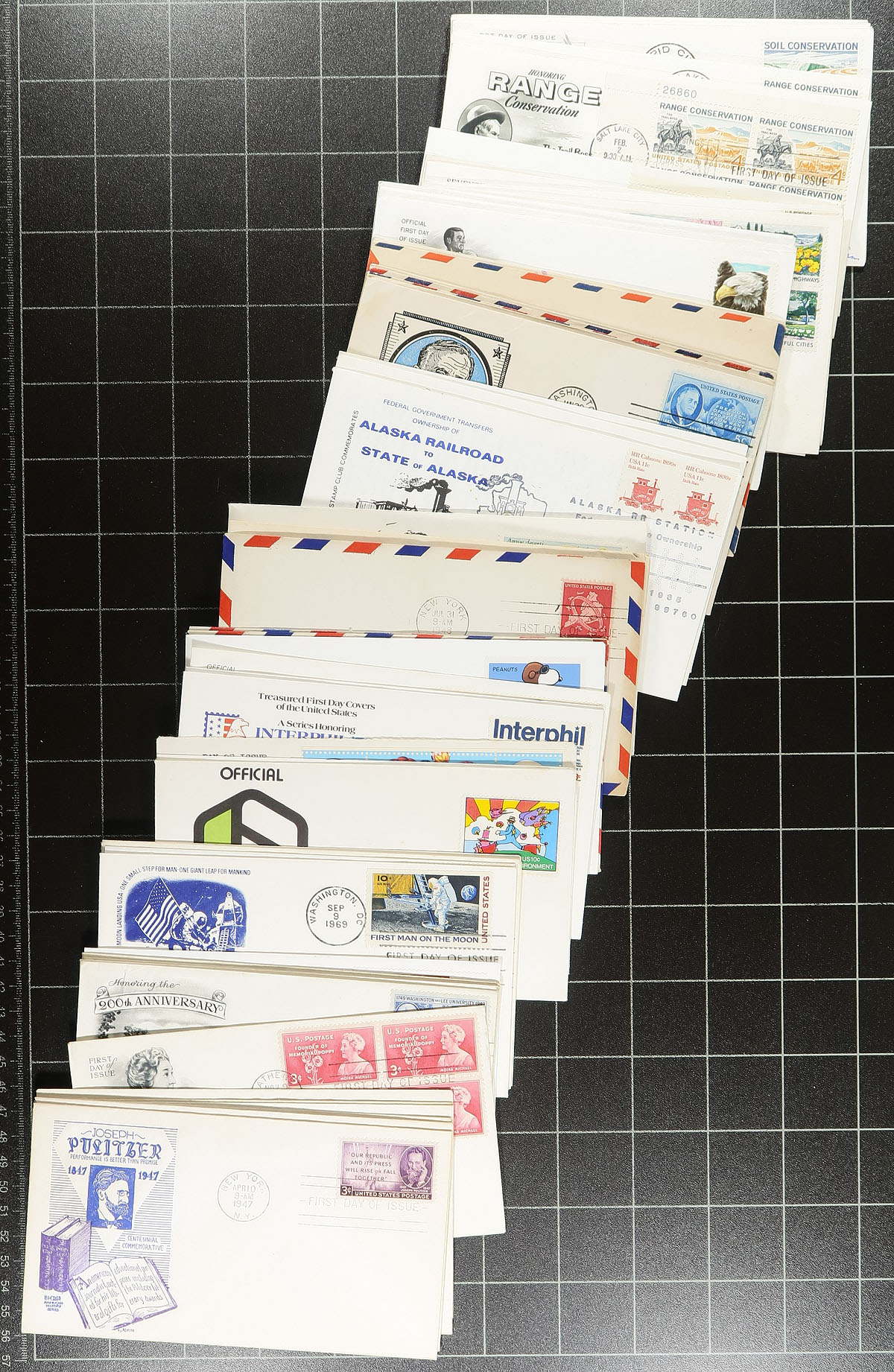 Lovely assortment of roughly 500 United States first day covers, 1930's-2000's, loose in a box. We note a nice variety of items noting singles, blocks, plate blocks, booklet panes, souvenir sheet, and high denomination frankings. Many of the covers have privately made cachets from Art Craft, Fleetwood, STC, Cachet Craft, C. Stephen Anderson, and more. Most of the covers retail $1 to $3 each, along with some in the $10 to $20 range. A nice lot for collectors and dealers alike. Estimate =
