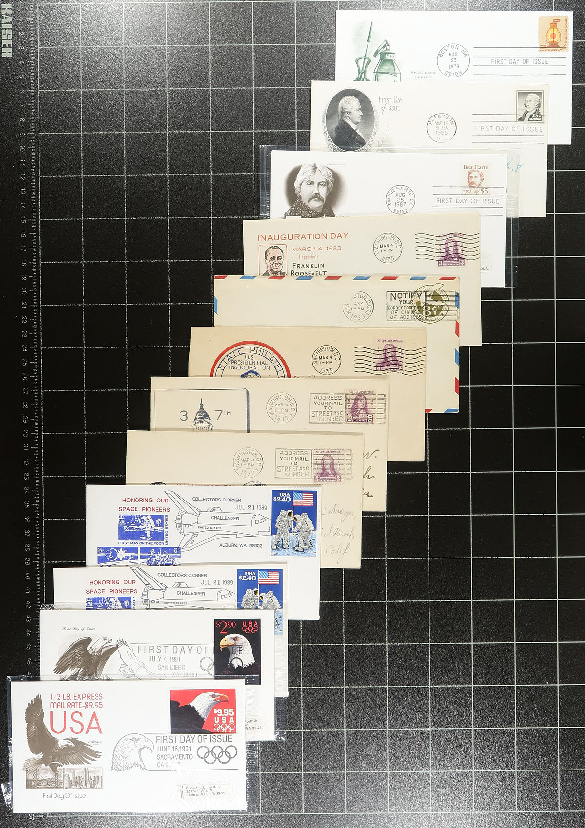 Lovely assortment of roughly 500 United States first day covers, 1930's-2000's, loose in a box. We note a nice variety of items noting singles, blocks, plate blocks, booklet panes, souvenir sheet, and high denomination frankings. Many of the covers have privately made cachets from Art Craft, Fleetwood, STC, Cachet Craft, C. Stephen Anderson, and more. Most of the covers retail $1 to $3 each, along with some in the $10 to $20 range. A nice lot for collectors and dealers alike. Estimate =