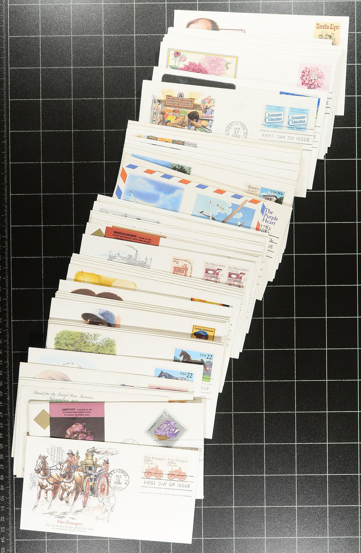 Lovely assortment of roughly 500 United States first day covers, 1930's-2000's, loose in a box. We note a nice variety of items noting singles, blocks, plate blocks, booklet panes, souvenir sheet, and high denomination frankings. Many of the covers have privately made cachets from Art Craft, Fleetwood, STC, Cachet Craft, C. Stephen Anderson, and more. Most of the covers retail $1 to $3 each, along with some in the $10 to $20 range. A nice lot for collectors and dealers alike. Estimate =