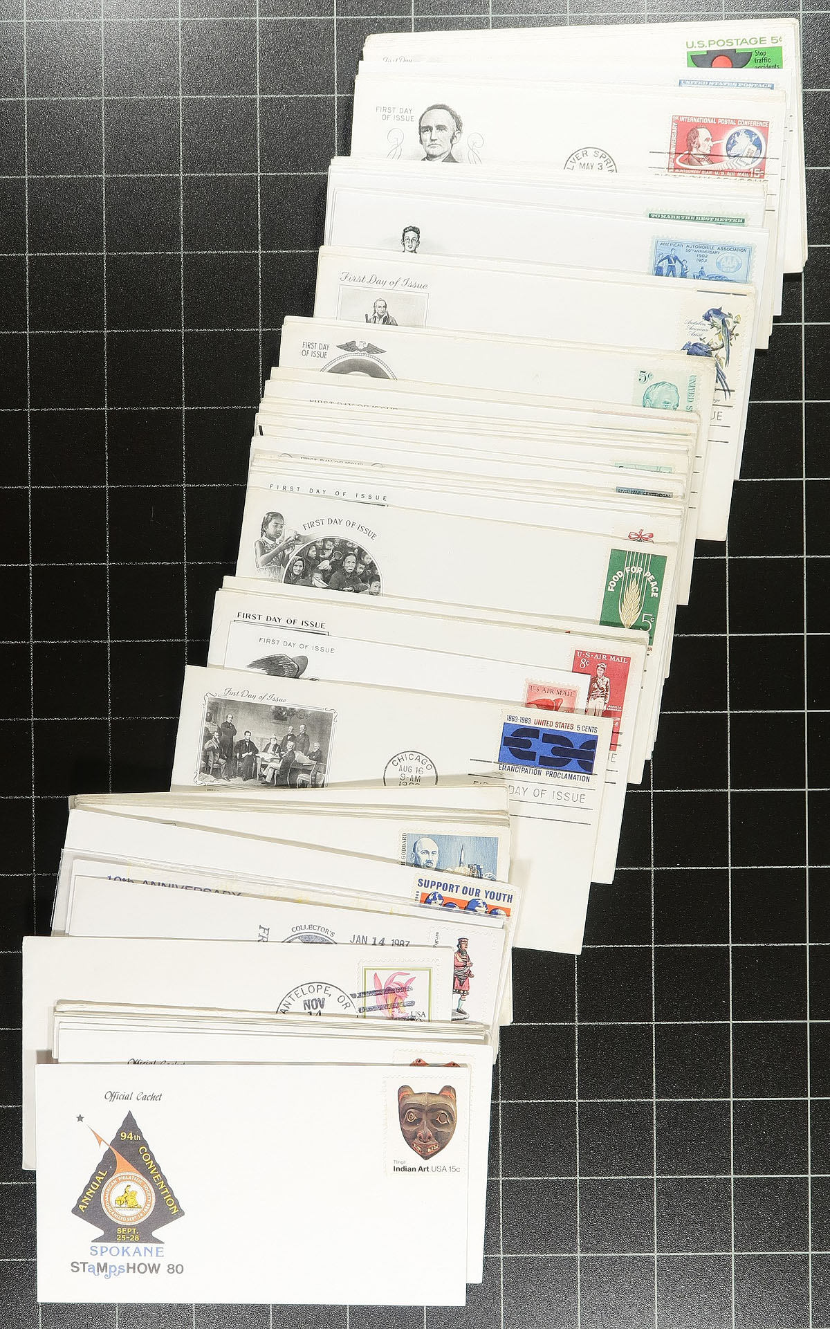 Lovely assortment of roughly 500 United States first day covers, 1930's-2000's, loose in a box. We note a nice variety of items noting singles, blocks, plate blocks, booklet panes, souvenir sheet, and high denomination frankings. Many of the covers have privately made cachets from Art Craft, Fleetwood, STC, Cachet Craft, C. Stephen Anderson, and more. Most of the covers retail $1 to $3 each, along with some in the $10 to $20 range. A nice lot for collectors and dealers alike. Estimate =