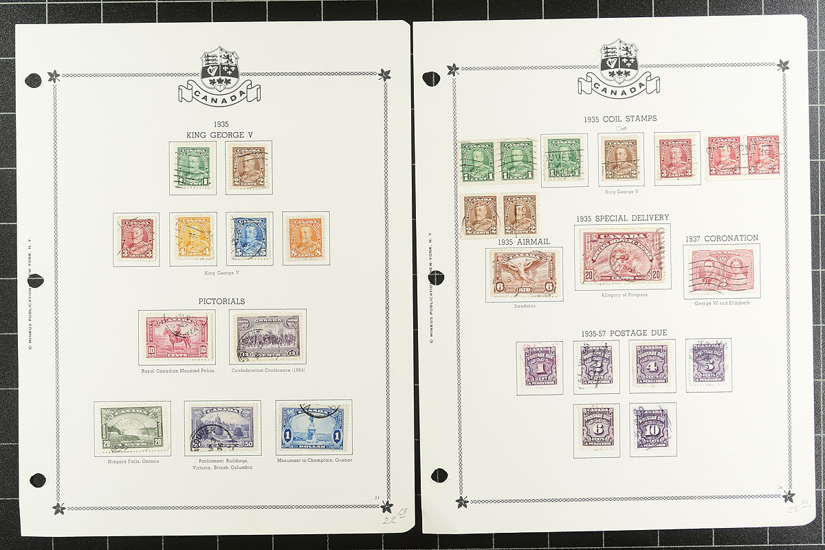 A tidy used collection 1897-1937, covering 40 years of Canadian issues from the Queen Victoria "Leaf" issue, to 1937 George VI Coronation, plus "back of the book". All neatly arranged on Minkus brand album pages within an album. Includes complete sets of QV Numerals, Edwards, Leaf/Numeral, Scroll etc. Very clean. Owner's 2021 Scott US$2,694.30 =
