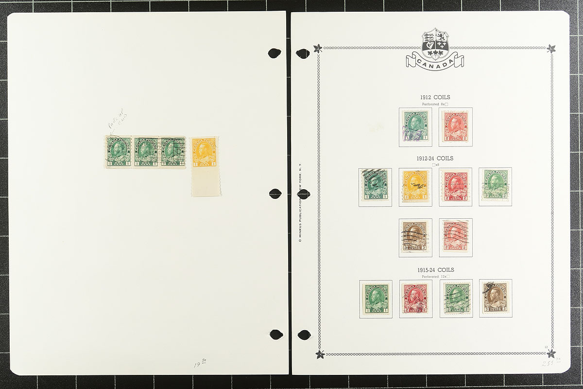 A tidy used collection 1897-1937, covering 40 years of Canadian issues from the Queen Victoria "Leaf" issue, to 1937 George VI Coronation, plus "back of the book". All neatly arranged on Minkus brand album pages within an album. Includes complete sets of QV Numerals, Edwards, Leaf/Numeral, Scroll etc. Very clean. Owner's 2021 Scott US$2,694.30 =