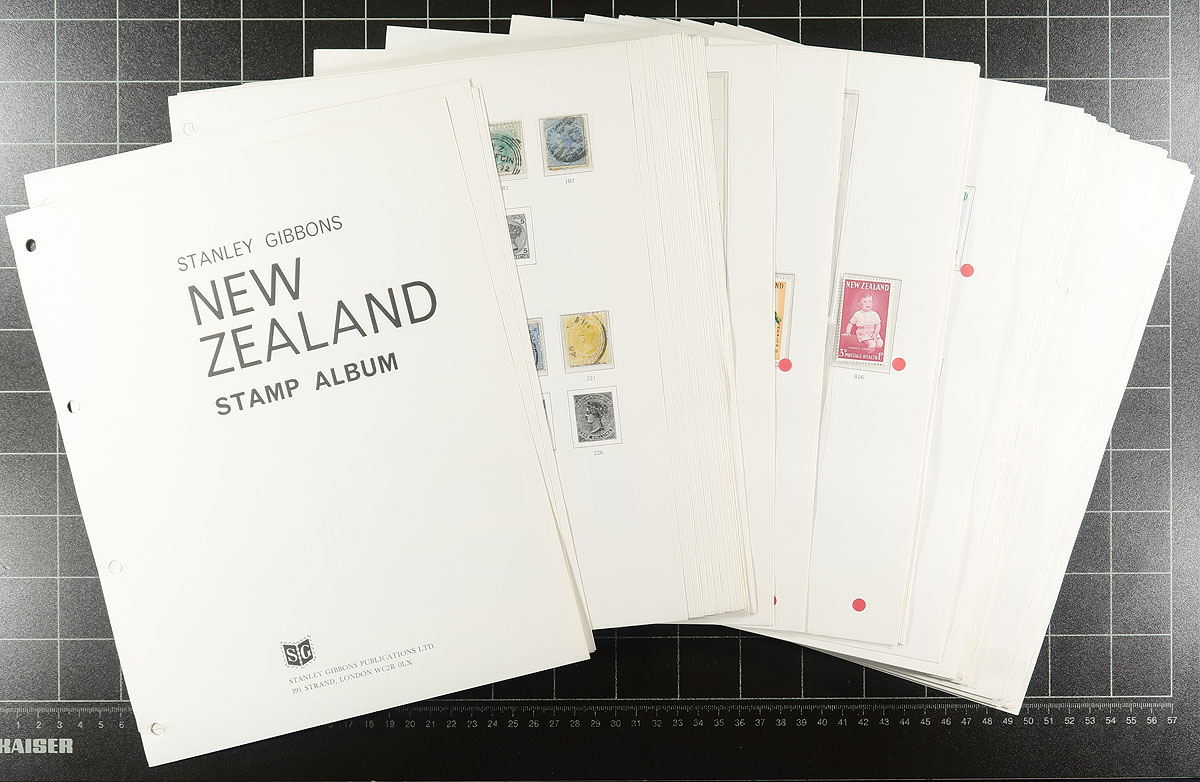 Mint and Used collection of New Zealand 1874-1975 (with pages to the beginning) in deluxe Stanley Gibbons padded album. About 90% complete for the period, with the majority of the earlier issues being used, before transitioning into mostly mint in the QEII era (in mounts, a mix of hinged/never hinged). A great "foot in the door" collection to be built upon, or take what you need to fill the holes in your own album. Owner's 2021 Scott US$1,533.10 =