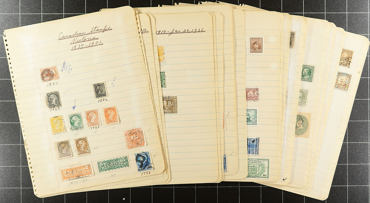 An old-time collection of (mostly) used, arranged on school-time quadrille pages. The Canadian stamps start in 1859, with the 5c Beaver, followed by a 1/2c Large Queen, Small Queens, 50c Widow Weed, 4x QV Jubilees (including a deep blue shade of the 50c value), Edwards to 10c, complete 1908 Tercentenary (5c, 10c, 15c, 20c mint, with the latter having a face scuff), Admirals, Confederation, Scroll (including 50c Bluenose / $1.00 Parliament), 1935 Pictorial, 1938 Pictorial, 1942 War Issue, 1946 Peace (50c and $1.00 mint) plus some "back of the book" and revenues. The USA portion has a smattering from several better sets including 1893 Columbian, 1898 Trans Mississippi, 1907 Jamestown, Parcel Post etc. Condition is a bit mixed (as usually seen on these older holdings) and stamps are mostly in-place with paper hinges, but still lots of value for someone looking for a "bit of elbow grease" work project. Estimate =