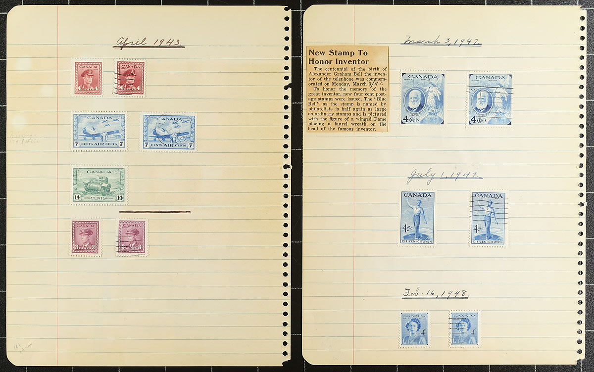 An old-time collection of (mostly) used, arranged on school-time quadrille pages. The Canadian stamps start in 1859, with the 5c Beaver, followed by a 1/2c Large Queen, Small Queens, 50c Widow Weed, 4x QV Jubilees (including a deep blue shade of the 50c value), Edwards to 10c, complete 1908 Tercentenary (5c, 10c, 15c, 20c mint, with the latter having a face scuff), Admirals, Confederation, Scroll (including 50c Bluenose / $1.00 Parliament), 1935 Pictorial, 1938 Pictorial, 1942 War Issue, 1946 Peace (50c and $1.00 mint) plus some "back of the book" and revenues. The USA portion has a smattering from several better sets including 1893 Columbian, 1898 Trans Mississippi, 1907 Jamestown, Parcel Post etc. Condition is a bit mixed (as usually seen on these older holdings) and stamps are mostly in-place with paper hinges, but still lots of value for someone looking for a "bit of elbow grease" work project. Estimate =