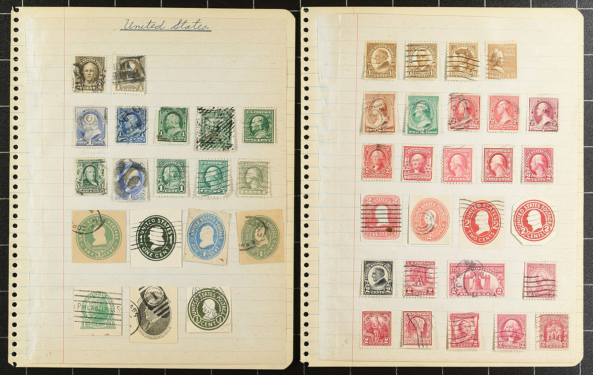 An old-time collection of (mostly) used, arranged on school-time quadrille pages. The Canadian stamps start in 1859, with the 5c Beaver, followed by a 1/2c Large Queen, Small Queens, 50c Widow Weed, 4x QV Jubilees (including a deep blue shade of the 50c value), Edwards to 10c, complete 1908 Tercentenary (5c, 10c, 15c, 20c mint, with the latter having a face scuff), Admirals, Confederation, Scroll (including 50c Bluenose / $1.00 Parliament), 1935 Pictorial, 1938 Pictorial, 1942 War Issue, 1946 Peace (50c and $1.00 mint) plus some "back of the book" and revenues. The USA portion has a smattering from several better sets including 1893 Columbian, 1898 Trans Mississippi, 1907 Jamestown, Parcel Post etc. Condition is a bit mixed (as usually seen on these older holdings) and stamps are mostly in-place with paper hinges, but still lots of value for someone looking for a "bit of elbow grease" work project. Estimate =