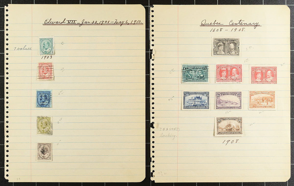 An old-time collection of (mostly) used, arranged on school-time quadrille pages. The Canadian stamps start in 1859, with the 5c Beaver, followed by a 1/2c Large Queen, Small Queens, 50c Widow Weed, 4x QV Jubilees (including a deep blue shade of the 50c value), Edwards to 10c, complete 1908 Tercentenary (5c, 10c, 15c, 20c mint, with the latter having a face scuff), Admirals, Confederation, Scroll (including 50c Bluenose / $1.00 Parliament), 1935 Pictorial, 1938 Pictorial, 1942 War Issue, 1946 Peace (50c and $1.00 mint) plus some "back of the book" and revenues. The USA portion has a smattering from several better sets including 1893 Columbian, 1898 Trans Mississippi, 1907 Jamestown, Parcel Post etc. Condition is a bit mixed (as usually seen on these older holdings) and stamps are mostly in-place with paper hinges, but still lots of value for someone looking for a "bit of elbow grease" work project. Estimate =