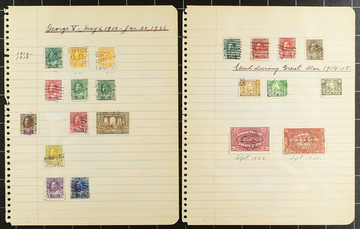 An old-time collection of (mostly) used, arranged on school-time quadrille pages. The Canadian stamps start in 1859, with the 5c Beaver, followed by a 1/2c Large Queen, Small Queens, 50c Widow Weed, 4x QV Jubilees (including a deep blue shade of the 50c value), Edwards to 10c, complete 1908 Tercentenary (5c, 10c, 15c, 20c mint, with the latter having a face scuff), Admirals, Confederation, Scroll (including 50c Bluenose / $1.00 Parliament), 1935 Pictorial, 1938 Pictorial, 1942 War Issue, 1946 Peace (50c and $1.00 mint) plus some "back of the book" and revenues. The USA portion has a smattering from several better sets including 1893 Columbian, 1898 Trans Mississippi, 1907 Jamestown, Parcel Post etc. Condition is a bit mixed (as usually seen on these older holdings) and stamps are mostly in-place with paper hinges, but still lots of value for someone looking for a "bit of elbow grease" work project. Estimate =