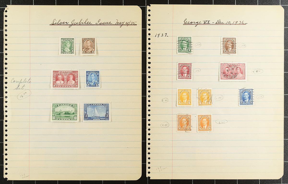 An old-time collection of (mostly) used, arranged on school-time quadrille pages. The Canadian stamps start in 1859, with the 5c Beaver, followed by a 1/2c Large Queen, Small Queens, 50c Widow Weed, 4x QV Jubilees (including a deep blue shade of the 50c value), Edwards to 10c, complete 1908 Tercentenary (5c, 10c, 15c, 20c mint, with the latter having a face scuff), Admirals, Confederation, Scroll (including 50c Bluenose / $1.00 Parliament), 1935 Pictorial, 1938 Pictorial, 1942 War Issue, 1946 Peace (50c and $1.00 mint) plus some "back of the book" and revenues. The USA portion has a smattering from several better sets including 1893 Columbian, 1898 Trans Mississippi, 1907 Jamestown, Parcel Post etc. Condition is a bit mixed (as usually seen on these older holdings) and stamps are mostly in-place with paper hinges, but still lots of value for someone looking for a "bit of elbow grease" work project. Estimate =