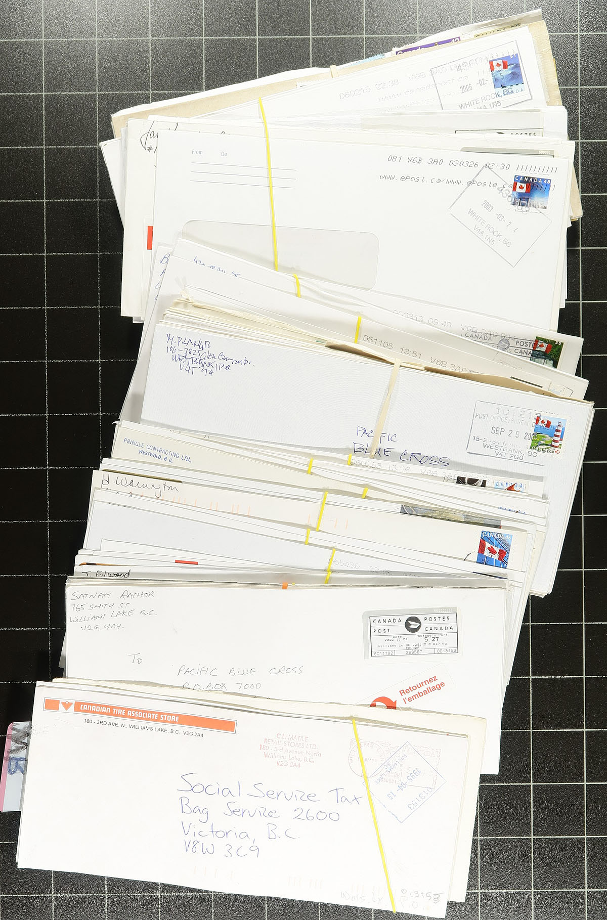 The behemoth BC Postmark Lot. A large box, absolutely stuffed with covers and cut-squares, all with BC Postmarks, arranged by the owner alphabetically. Many thousands of postmarks in total, seemingly primarily from the QEII era, but with earlier noted as well. The perfect lot for the postmark hound, looking for cancellation types, dates etc. Well worth our reasonable estimated value. Estimate =