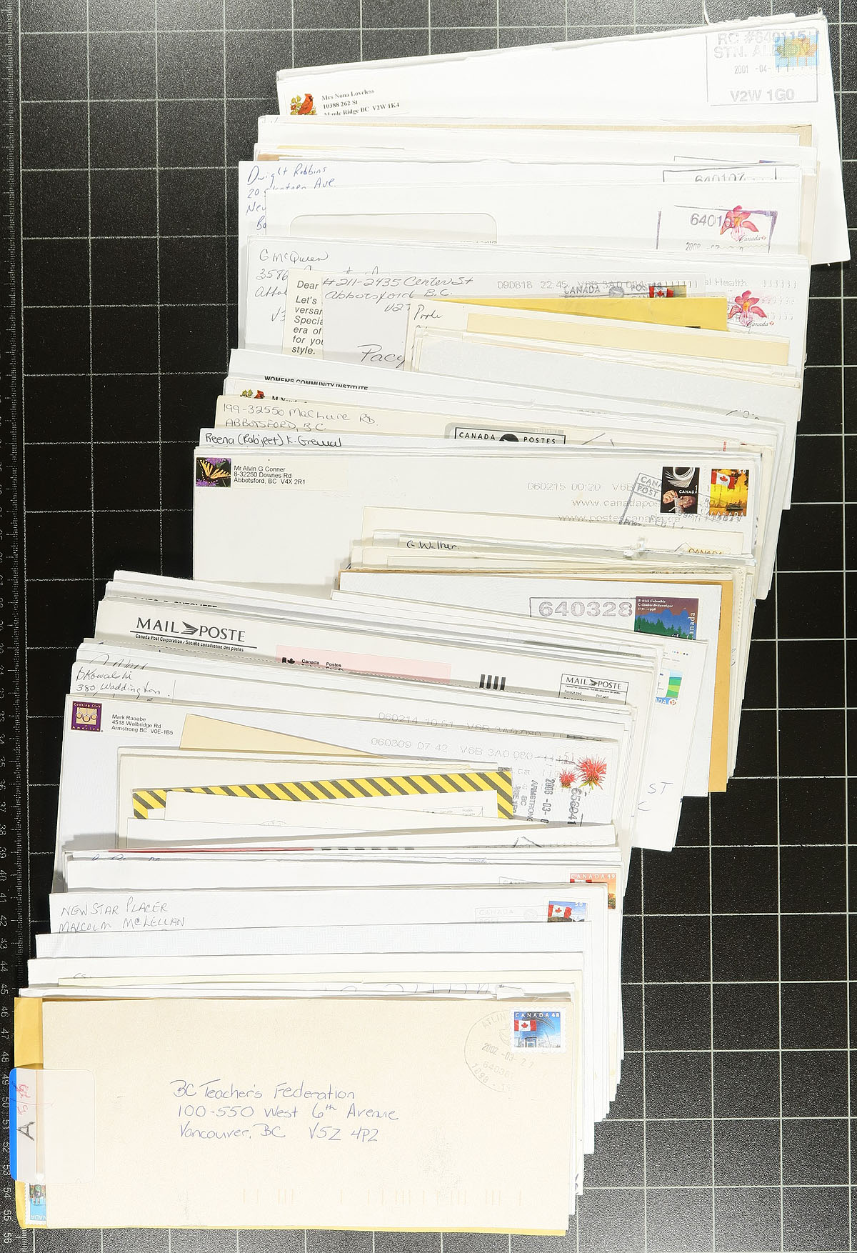 The behemoth BC Postmark Lot. A large box, absolutely stuffed with covers and cut-squares, all with BC Postmarks, arranged by the owner alphabetically. Many thousands of postmarks in total, seemingly primarily from the QEII era, but with earlier noted as well. The perfect lot for the postmark hound, looking for cancellation types, dates etc. Well worth our reasonable estimated value. Estimate =
